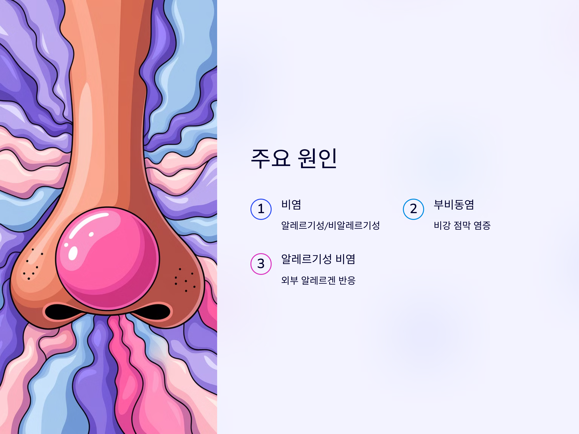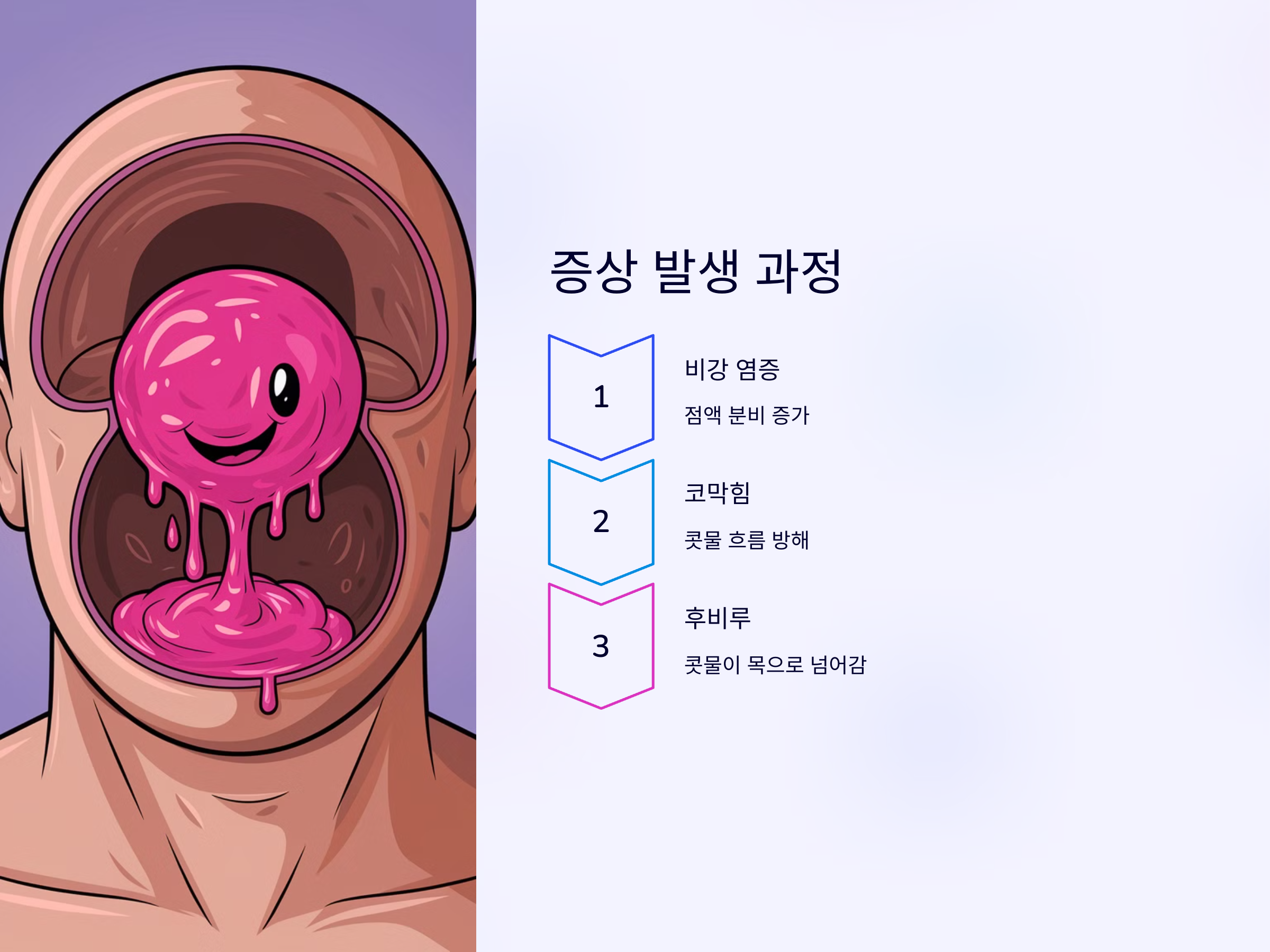 코는 기본적으로 외부에서 들어오는 공기를 걸러주는 역할을 합니다. 그러나 알레르기나 감기 등으로 인해 비강 내 점막이 염증을 일으키면, 정상적으로 흐르는 콧물이 막히거나 점액이 분비됩니다. 이 점액이 코막힘을 유발하고, 분비된 콧물이 목 뒤로 흐르게 되어 후비루 증상이 발생합니다.