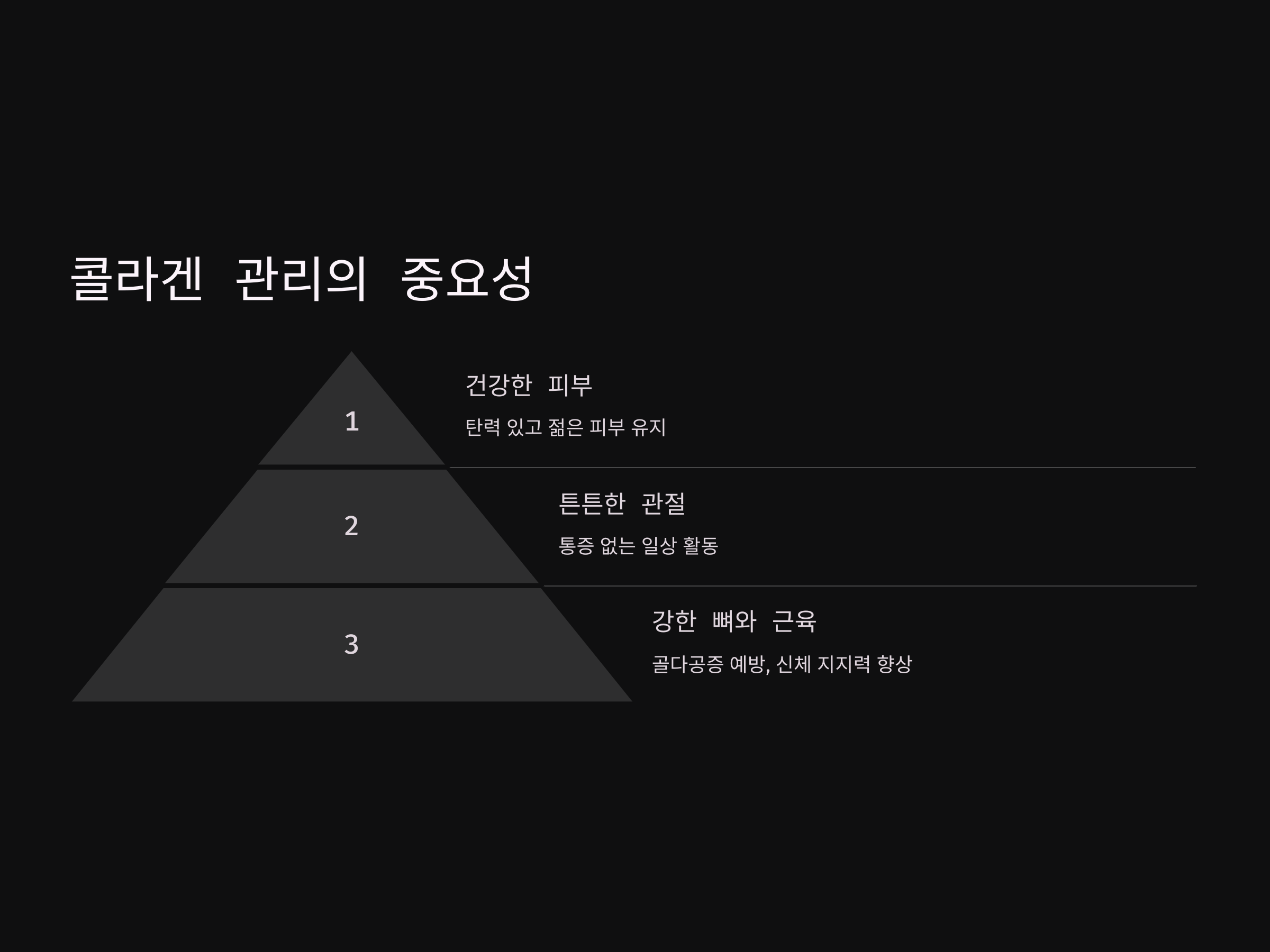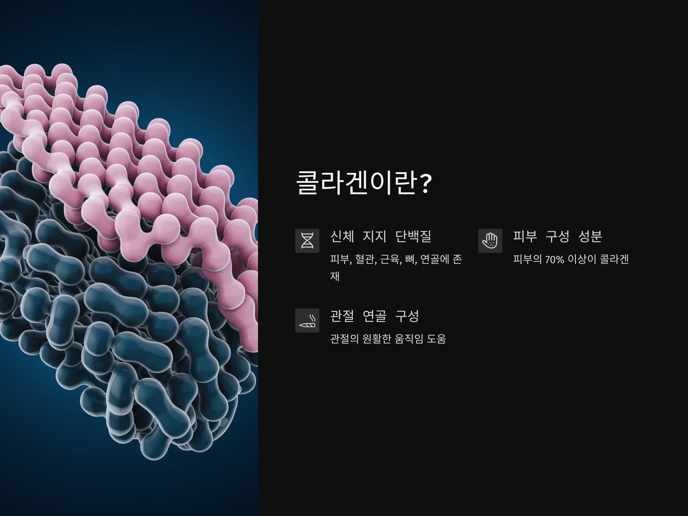 콜라겐은 피부, 혈관, 근육, 뼈, 연골 등 신체 여러 부위에 존재하는 단백질로, 신체를 지지하고 보호하는 역할을 합니다. 특히 피부의 경우, 콜라겐은 탄력성을 제공하고 피부를 팽팽하게 유지하는 데 중요한 역할을 합니다. 나이가 들면서 콜라겐의 생성량은 자연적으로 감소하는데, 이로 인해 피부의 탄력이 떨어지고 주름이 생기며, 관절에 통증이 발생할 수 있습니다.