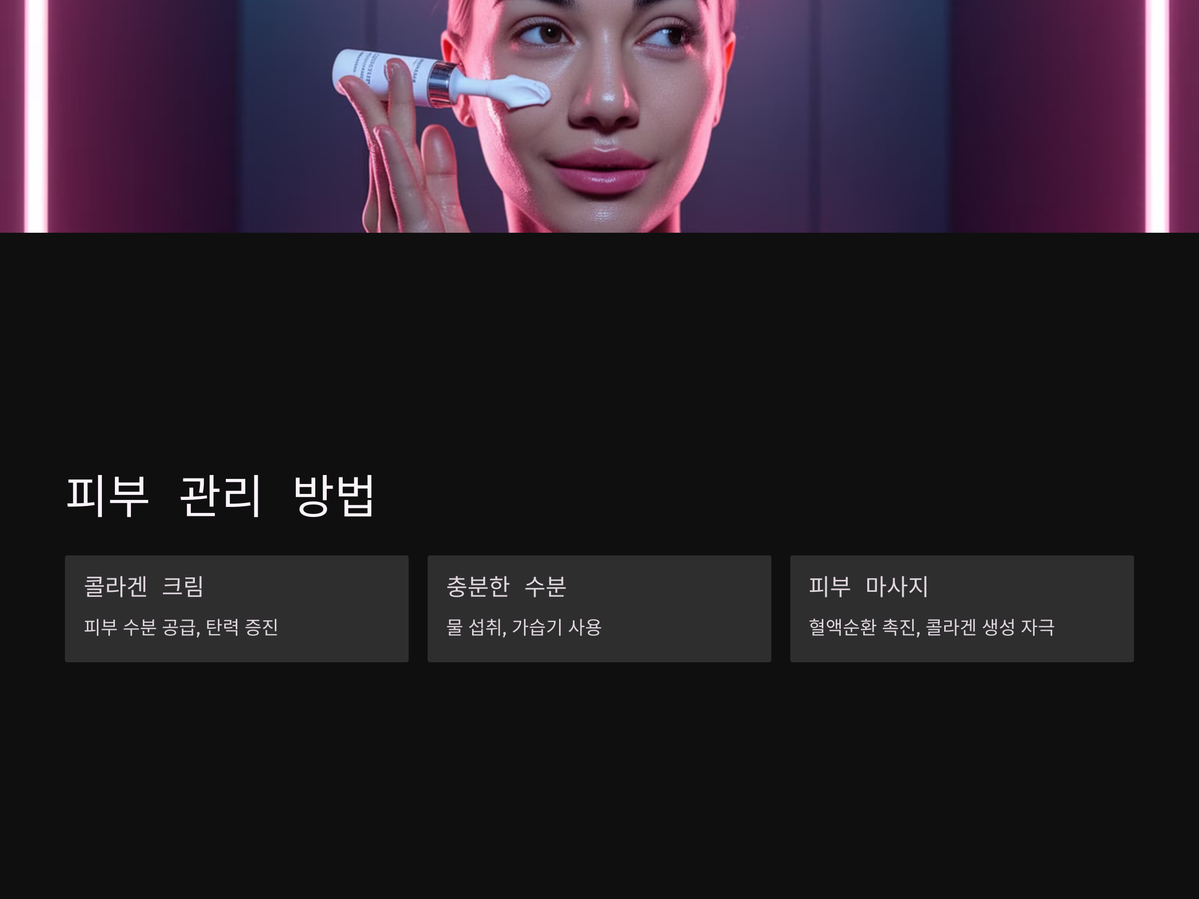 피부에 수분이 부족하면 콜라겐 합성이 제대로 이루어지지 않습니다. 충분한 수분을 섭취하고, 건조한 환경에서는 가습기를 사용하여 피부를 촉촉하게 유지하는 것이 중요합니다.