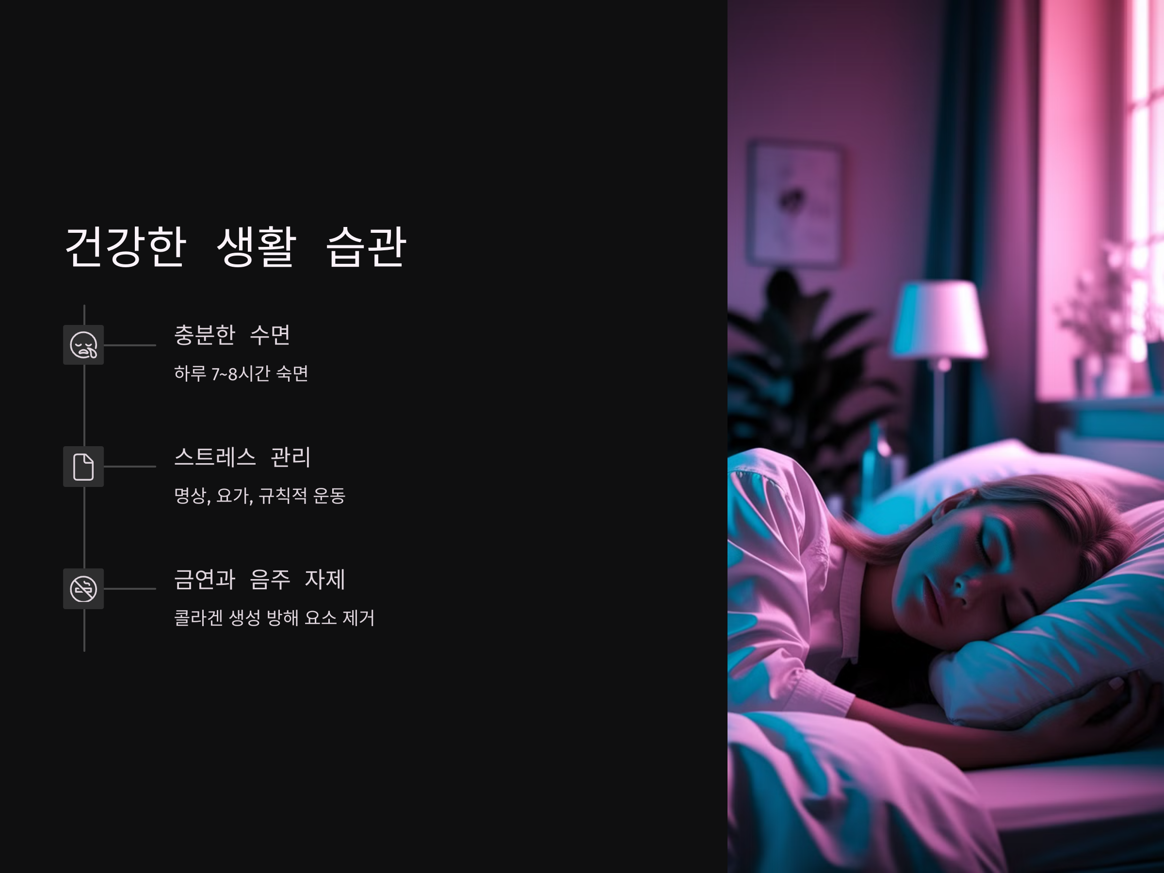 콜라겐 부족을 예방하기 위해서는 일상적인 생활 습관도 매우 중요합니다. 스트레스 관리, 건강한 식습관, 충분한 수면 등이 모두 콜라겐의 생성과 유지에 중요한 역할을 합니다.