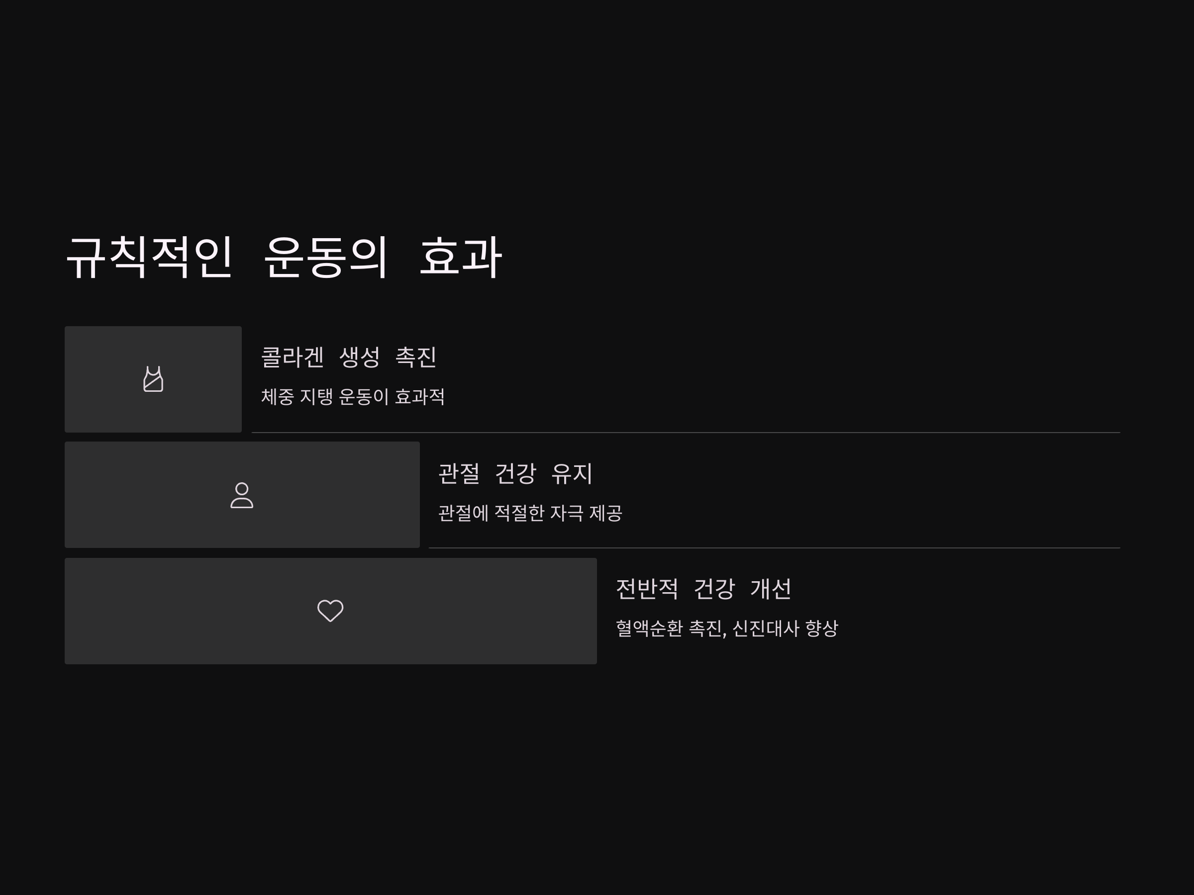 규칙적인 운동은 콜라겐 생성을 촉진하고 관절을 건강하게 유지하는 데 도움이 됩니다. 특히, 체중을 지탱하는 운동(걷기, 달리기, 자전거 타기 등)은 관절에 부담을 주지 않으면서도 콜라겐 생성에 도움을 줍니다. 운동은 전반적인 건강에 긍정적인 영향을 미치므로 꾸준히 실천하는 것이 좋습니다.