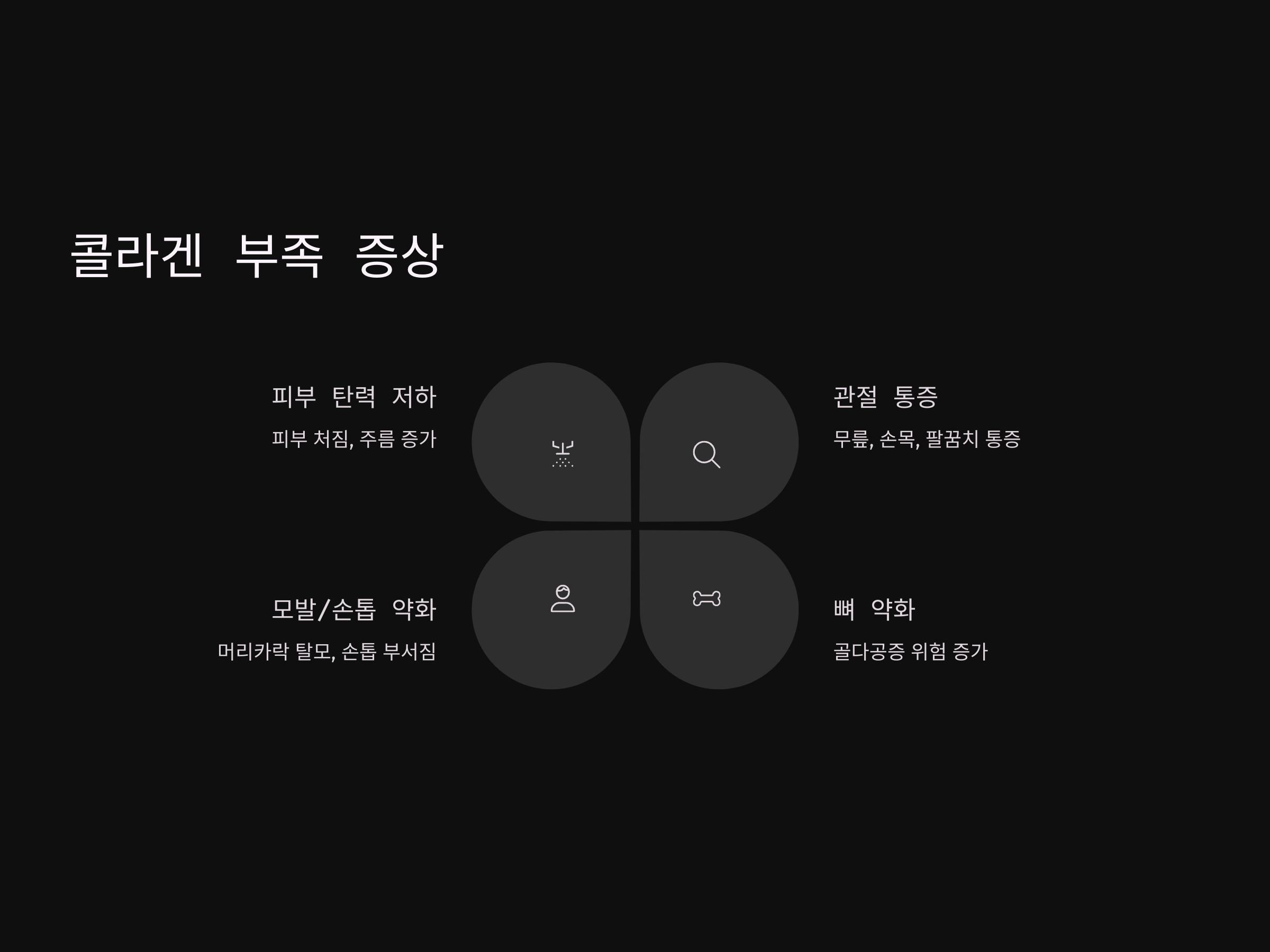 콜라겐 부족이 나타나면 여러 가지 증상이 생깁니다. 대표적으로 피부 탄력 저하와 관절 통증이 있습니다. 이 외에도 콜라겐 부족으로 인해 나타날 수 있는 증상들은 다음과 같습니다.