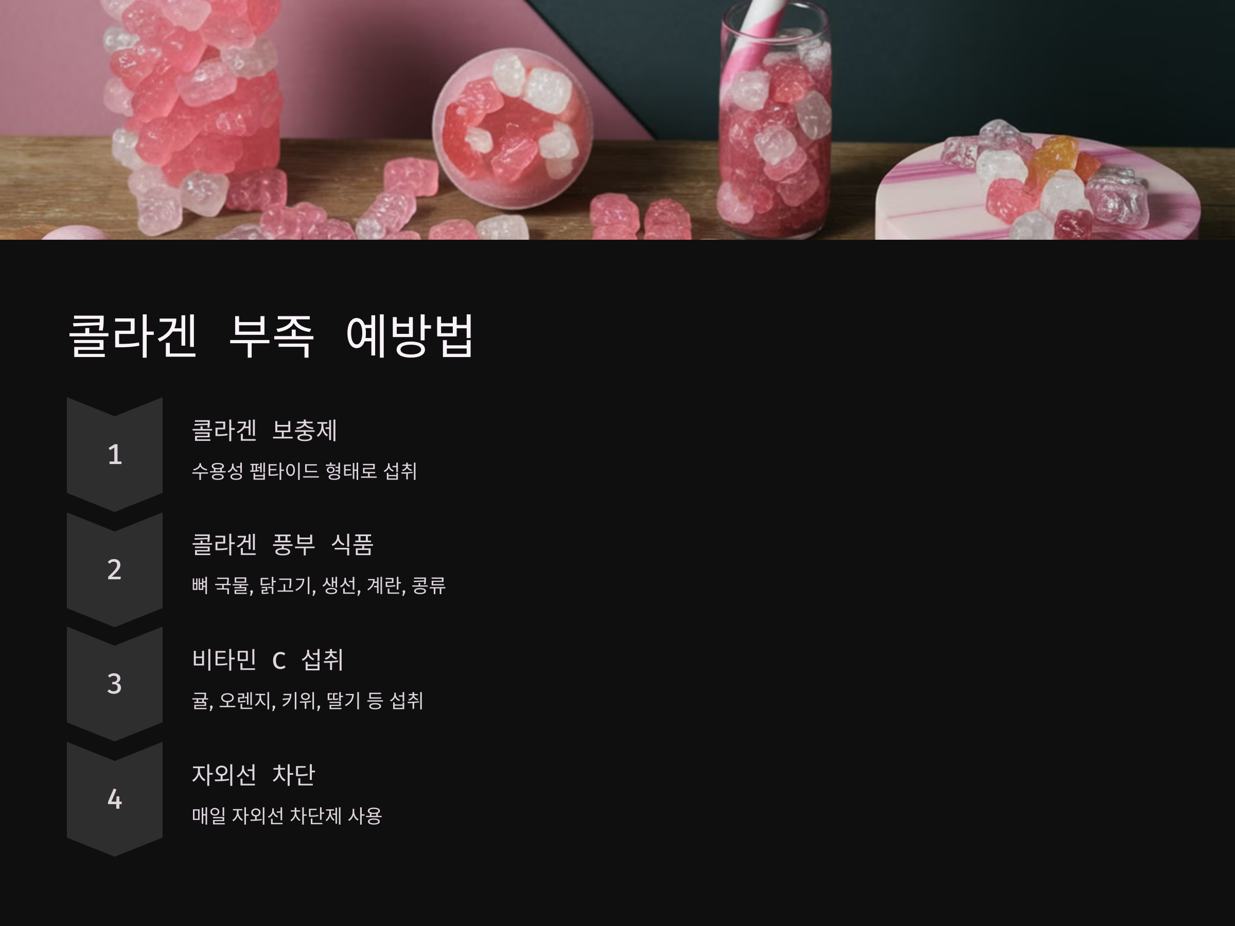 콜라겐 부족을 예방하고 개선하는 방법에는 다양한 방법이 있습니다. 일상에서 쉽게 실천할 수 있는 방법들을 소개합니다.