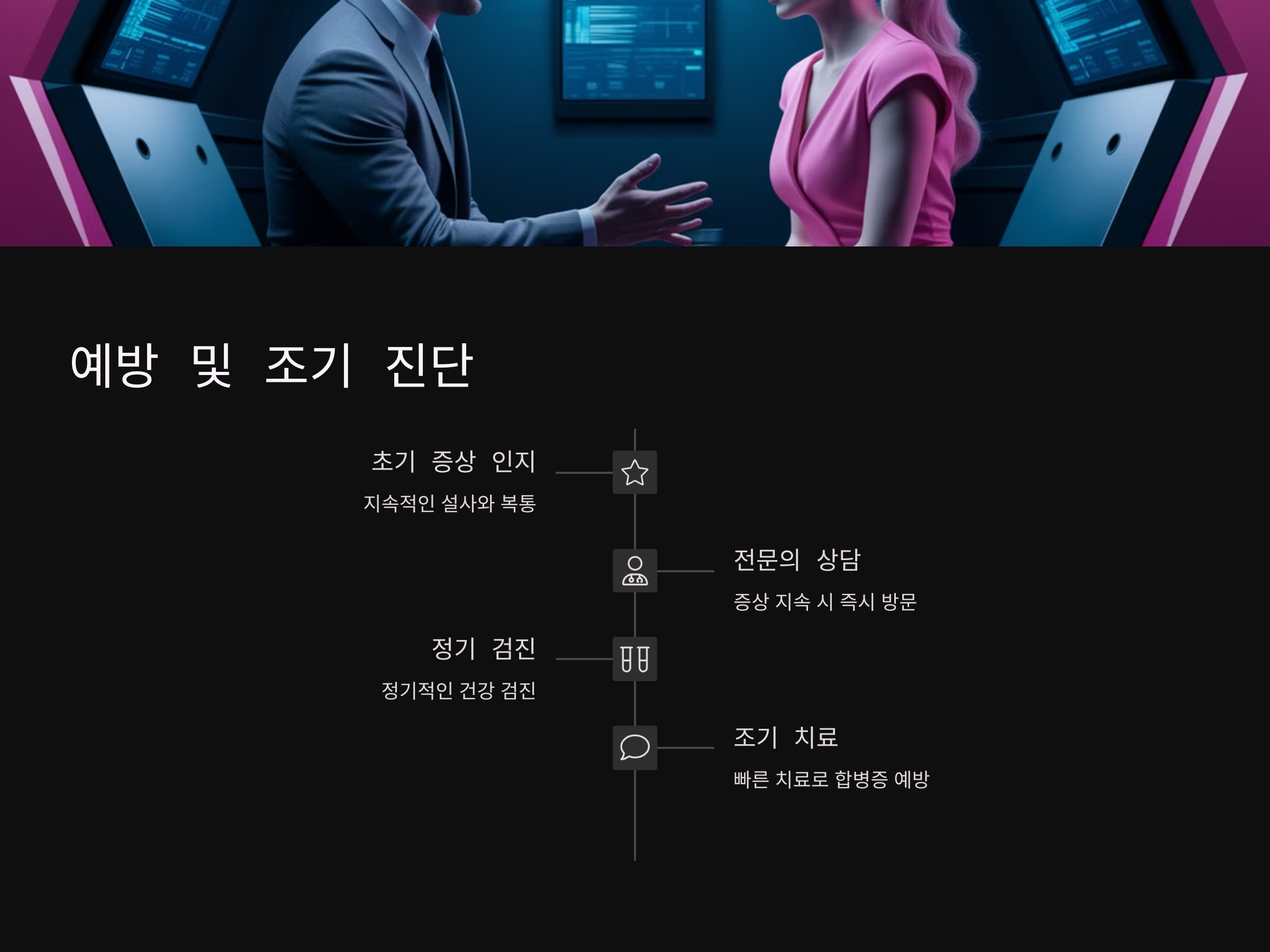 조기 진단과 적절한 치료는 만성 설사로 인한 합병증을 예방하고, 더 나은 삶의 질을 유지하는 데 큰 도움이 됩니다. 따라서 정기적인 검사와 건강한 생활 습관을 유지하는 것이 중요합니다.