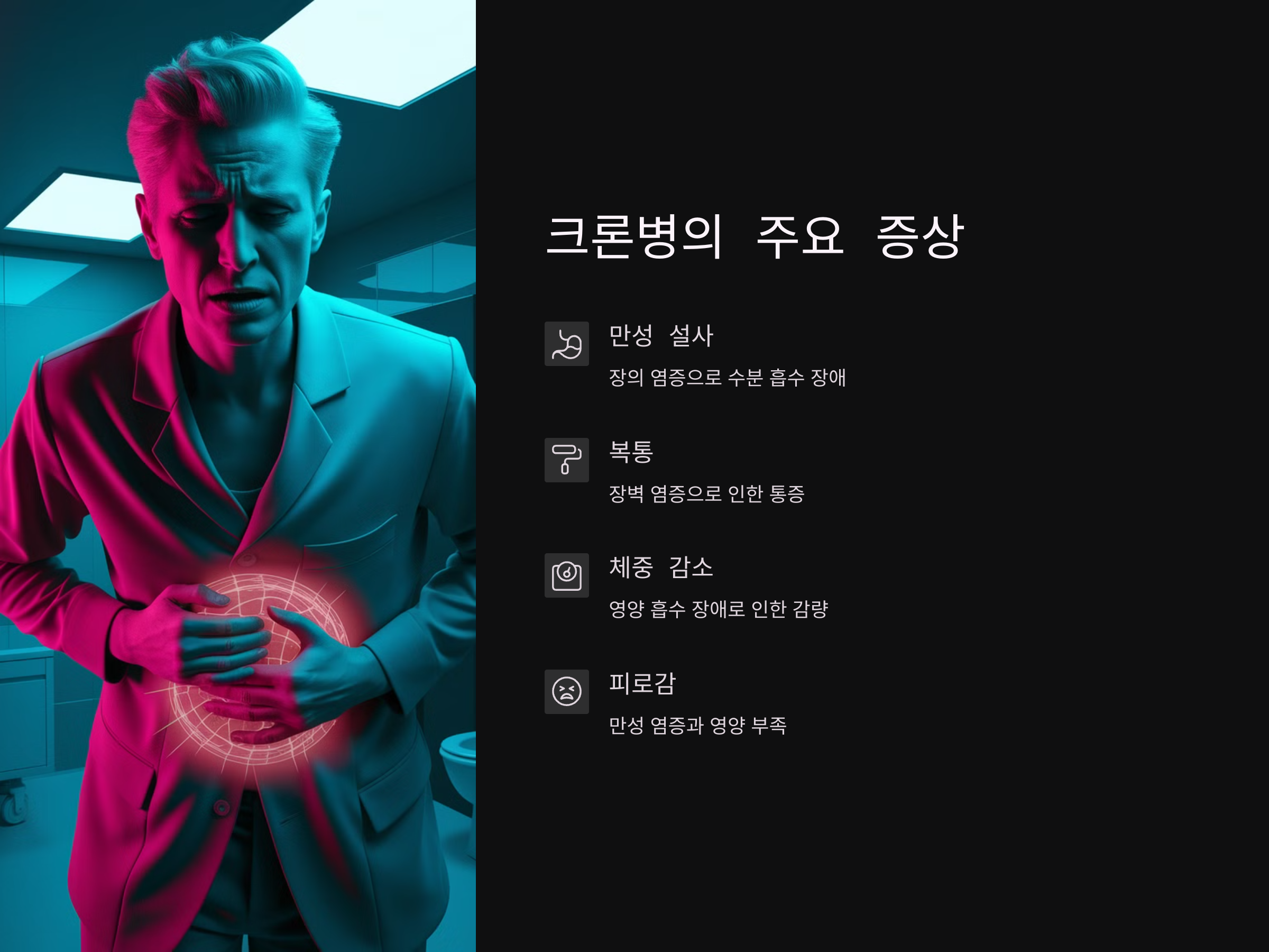 크론병의 만성 설사 원인은 염증이 장벽에 영향을 미치고, 장의 기능을 방해하면서 수분 흡수를 제대로 하지 못하게 되기 때문입니다. 이러한 장의 염증은 배변이 잦아지거나 설사 형태로 나타나게 됩니다. 따라서 크론병 환자들은 만성 설사와 함께 다양한 소화기 증상에 시달릴 수 있습니다. 이 외에도 복통, 피로감, 체중 감소 등도 흔한 증상으로 동반될 수 있습니다.