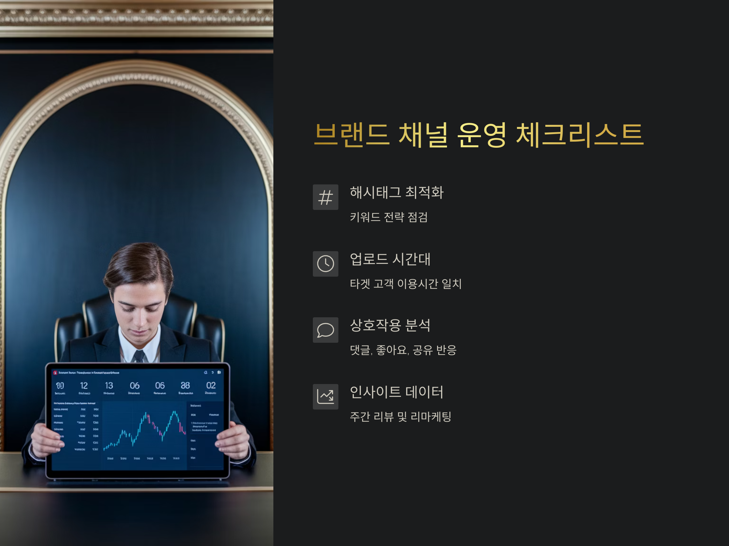이러한 체크리스트는 단순 반복업무처럼 보일 수 있지만, 알고리즘 최적화와 콘텐츠 방향 설정에 결정적입니다. 특히 업로드 시간대와 콘텐츠 타입에 따라 노출 수치가 극단적으로 달라지기 때문에, 일관된 운영 패턴이 필수입니다.