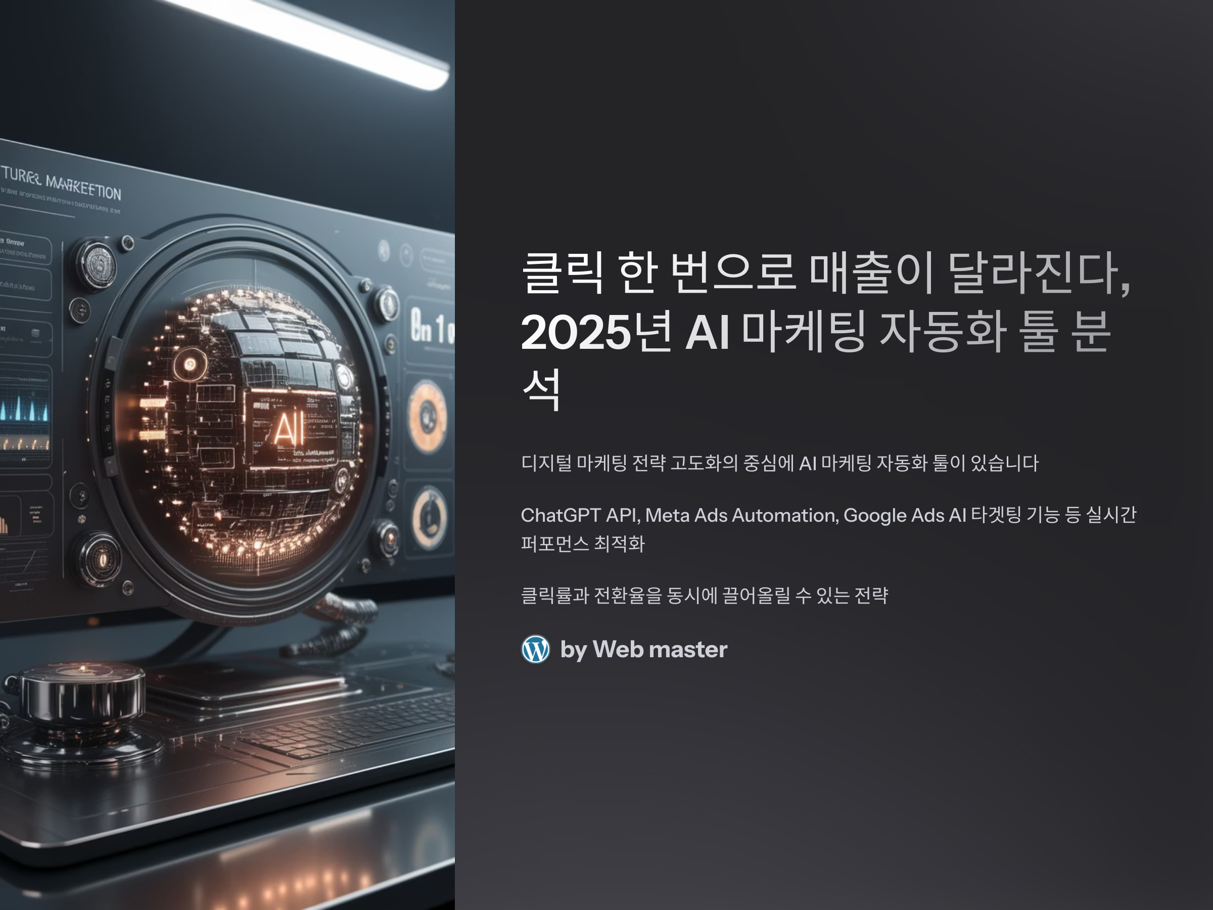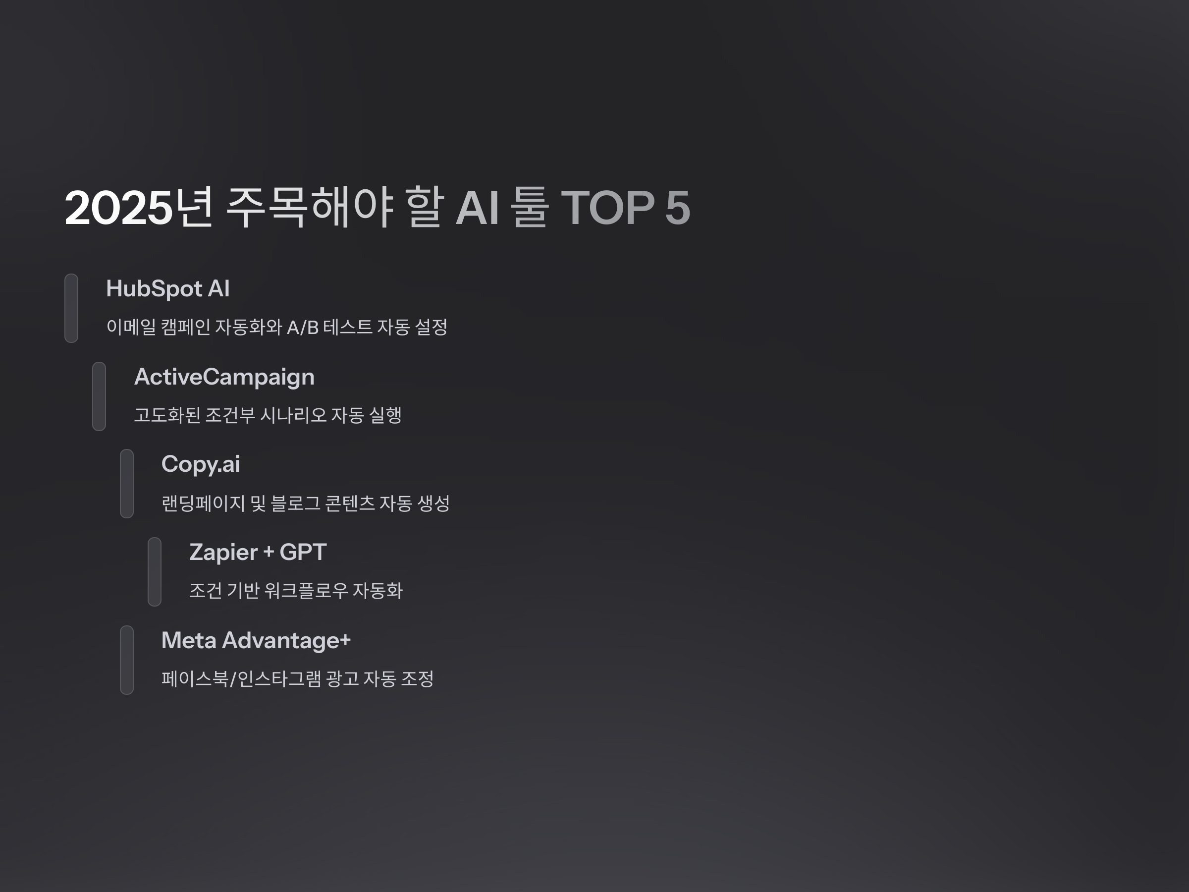 AI 마케팅, 자동화 툴, 2025년 마케팅 트렌드, 마케팅 자동화, 매출 증가 전략, CRM 연동, 콘텐츠 자동 생성, 구글 광고 최적화, 고객 세분화, 디지털 전환 전략 마케팅 자동화