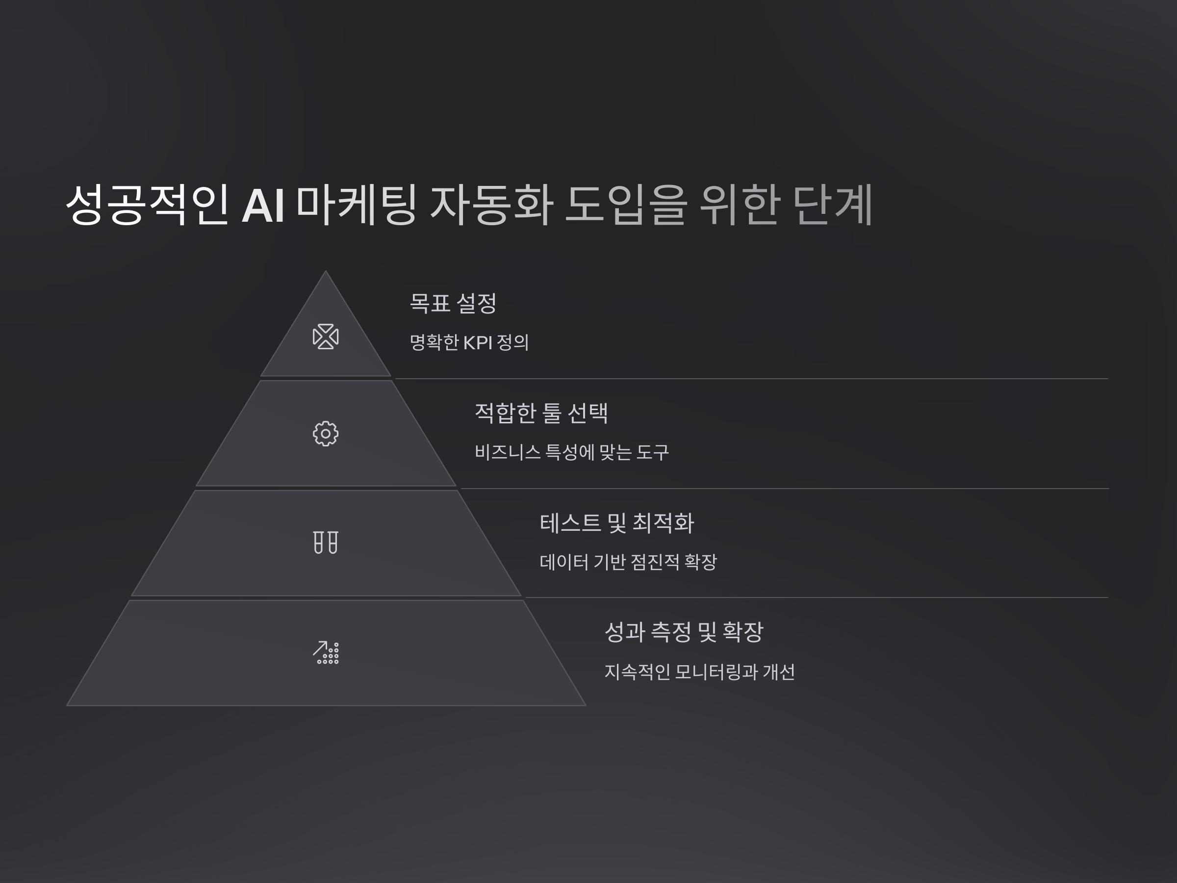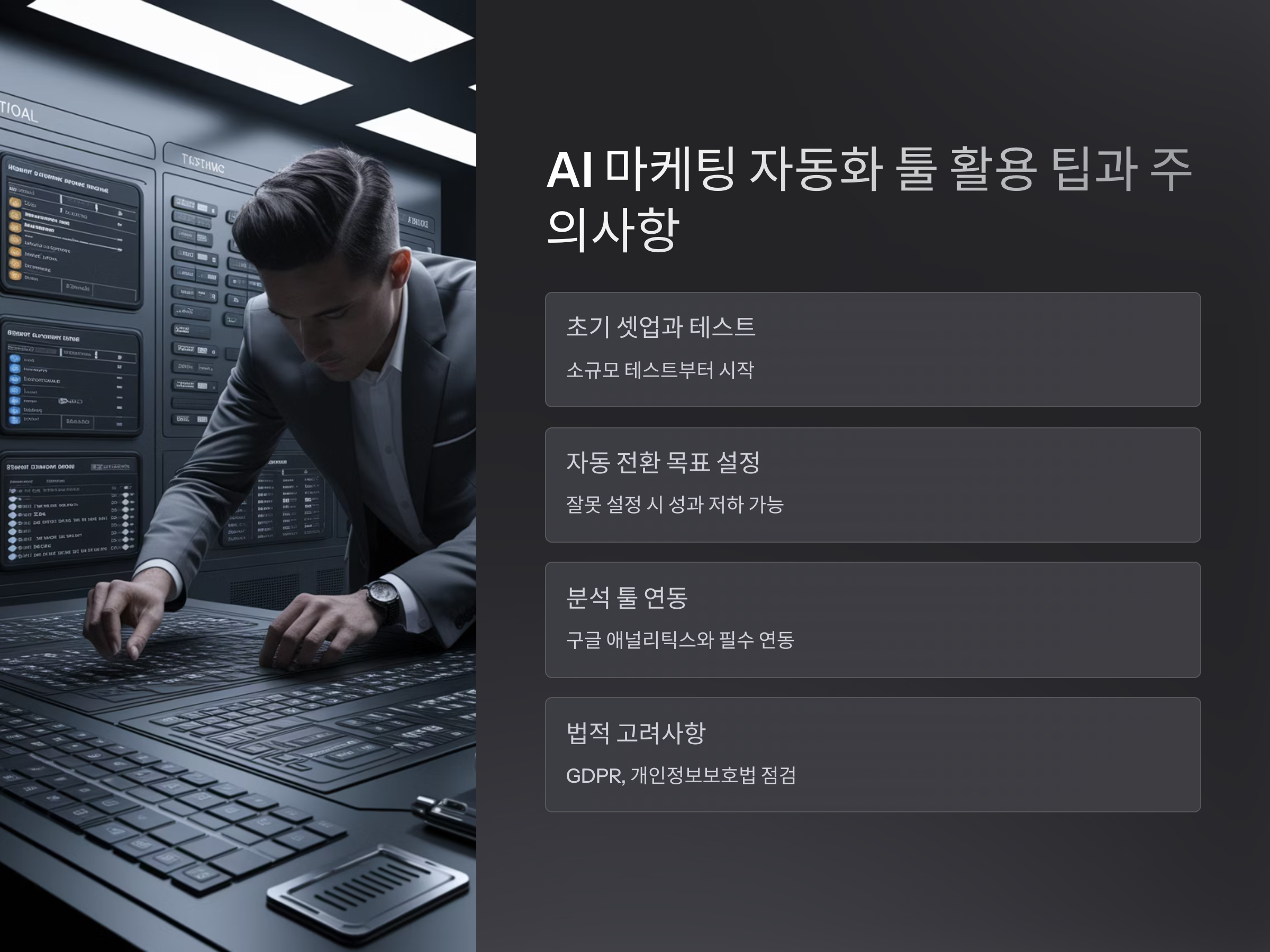 툴의 도입보다 더 중요한 것은 초기 셋업과 테스트입니다. 예를 들어 '자동 전환 목표 설정'을 잘못하면 오히려 성과가 저하될 수 있습니다. 반드시 소규모 테스트부터 시작하여 데이터를 바탕으로 점진적 확장을 해야 하며, 구글 애널리틱스와 같은 분석 툴과 연동도 필수입니다. 이외에도 GDPR, 개인정보보호법 등 법적 고려사항도 점검해야 합니다.