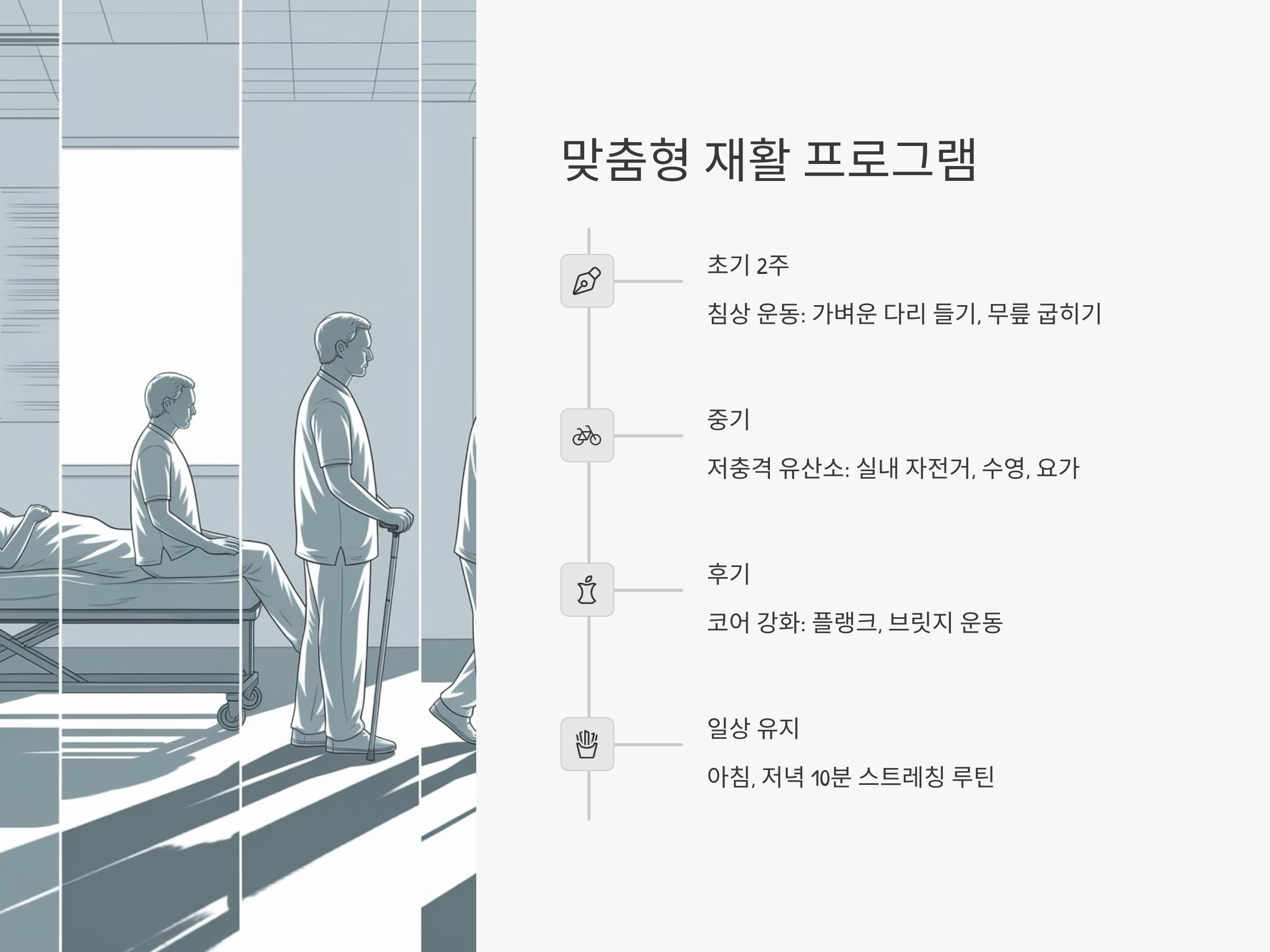 초기에는 침상에서 시작하는 가벼운 다리 들기 운동, 무릎 굽히기 등의 운동을 포함합니다. 이후에는 실내 자전거 타기, 수영, 요가 등 저충격 유산소 운동을 중심으로 구성되며, 코어 안정성을 위한 플랭크, 브릿지 운동도 병행됩니다. 일상에서 실천 가능한 스트레칭 루틴을 만들어 아침, 저녁 10분씩 반복하는 것도 매우 효과적입니다.