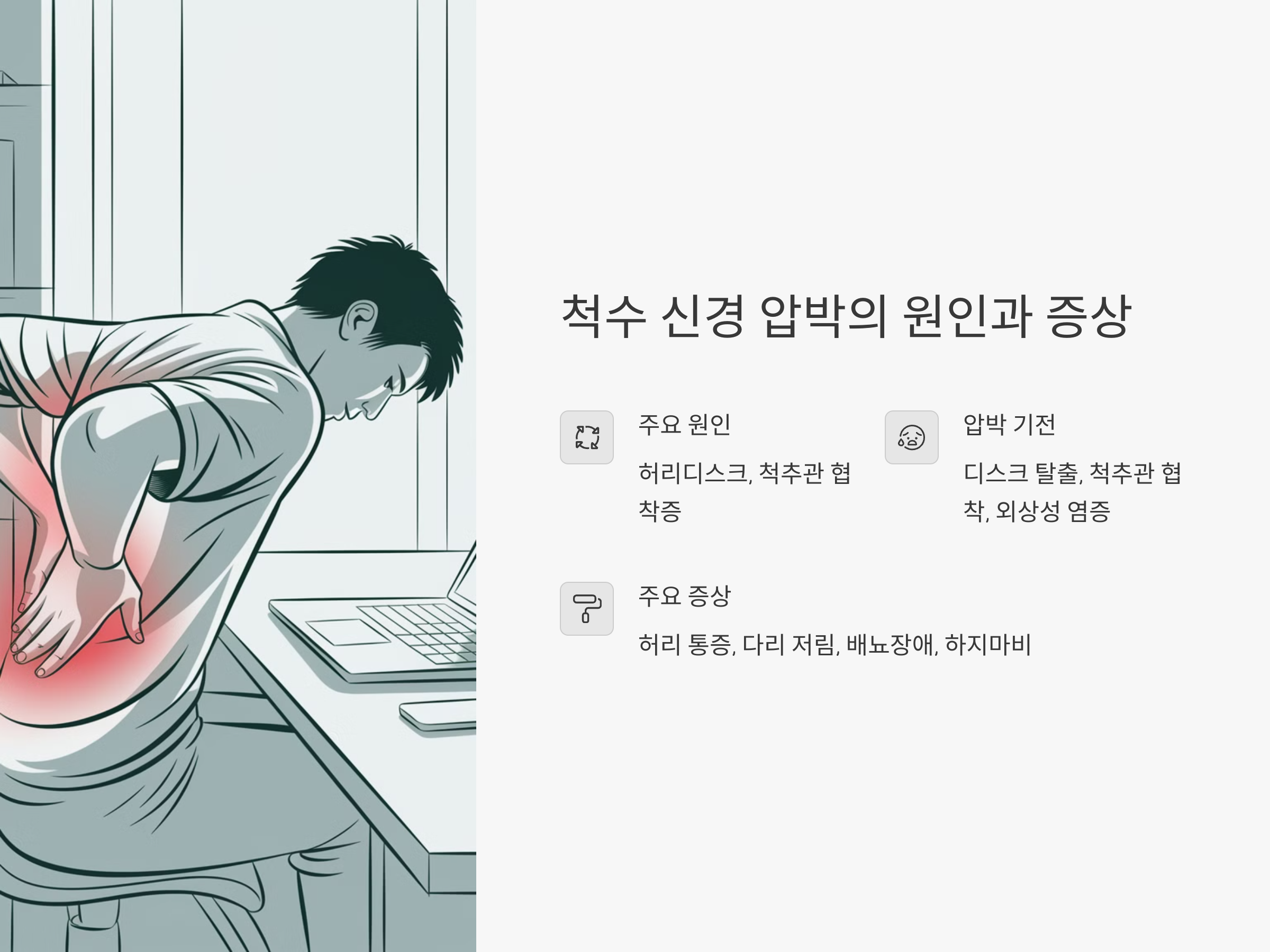 척수 신경 압박은 척추 뼈 사이에서 신경이 눌리면서 발생하는 질환으로, 허리 통증이나 다리 저림 같은 증상이 대표적입니다. 특히 허리디스크(요추 추간판 탈출증)나 척추관 협착증과 같은 질환이 주요 원인으로 작용합니다. 압박 부위에 따라 통증이 발생하는 부위가 달라지며, 심한 경우에는 배뇨장애나 하지마비 같은 신경학적 증상도 동반됩니다.