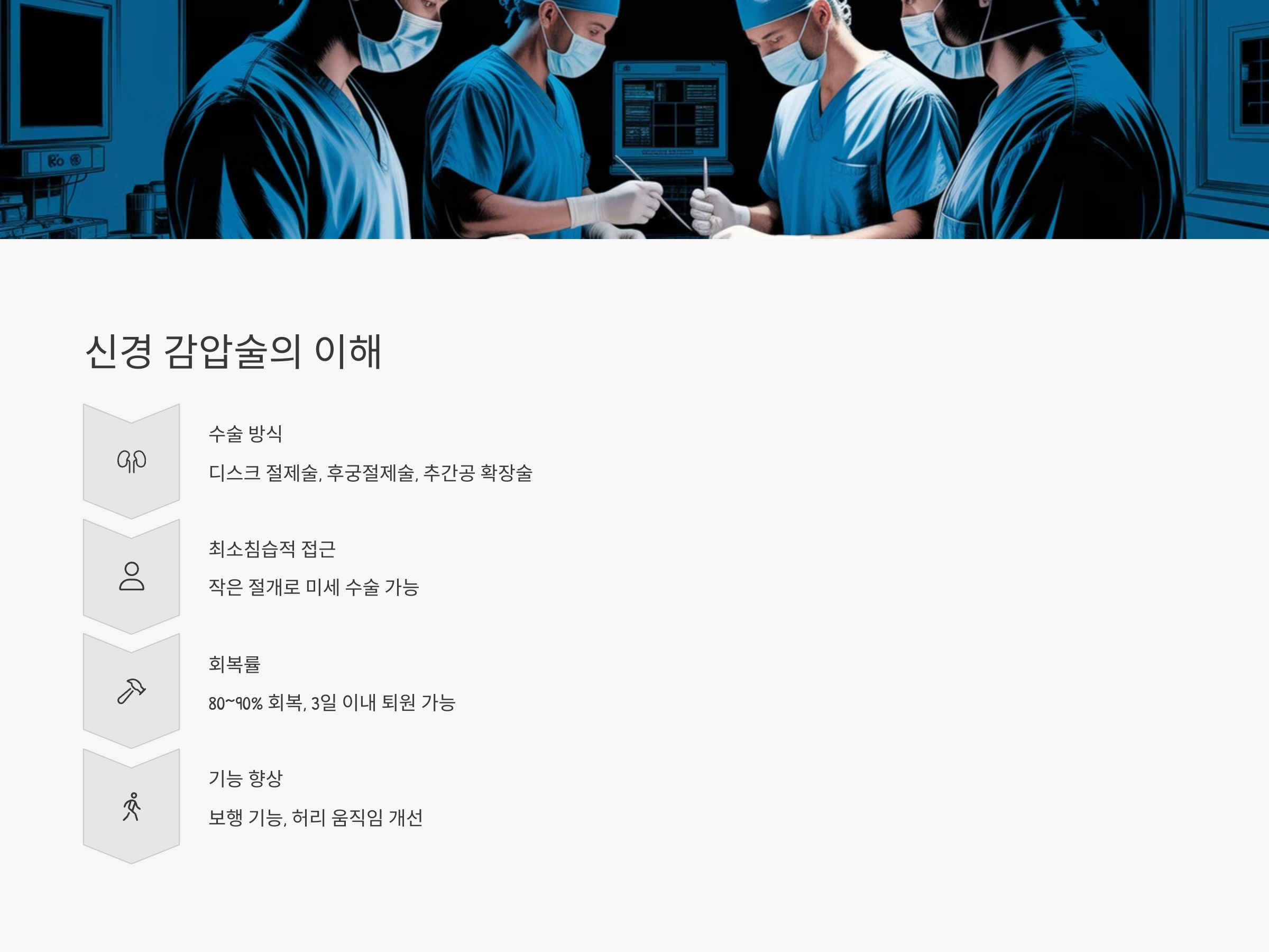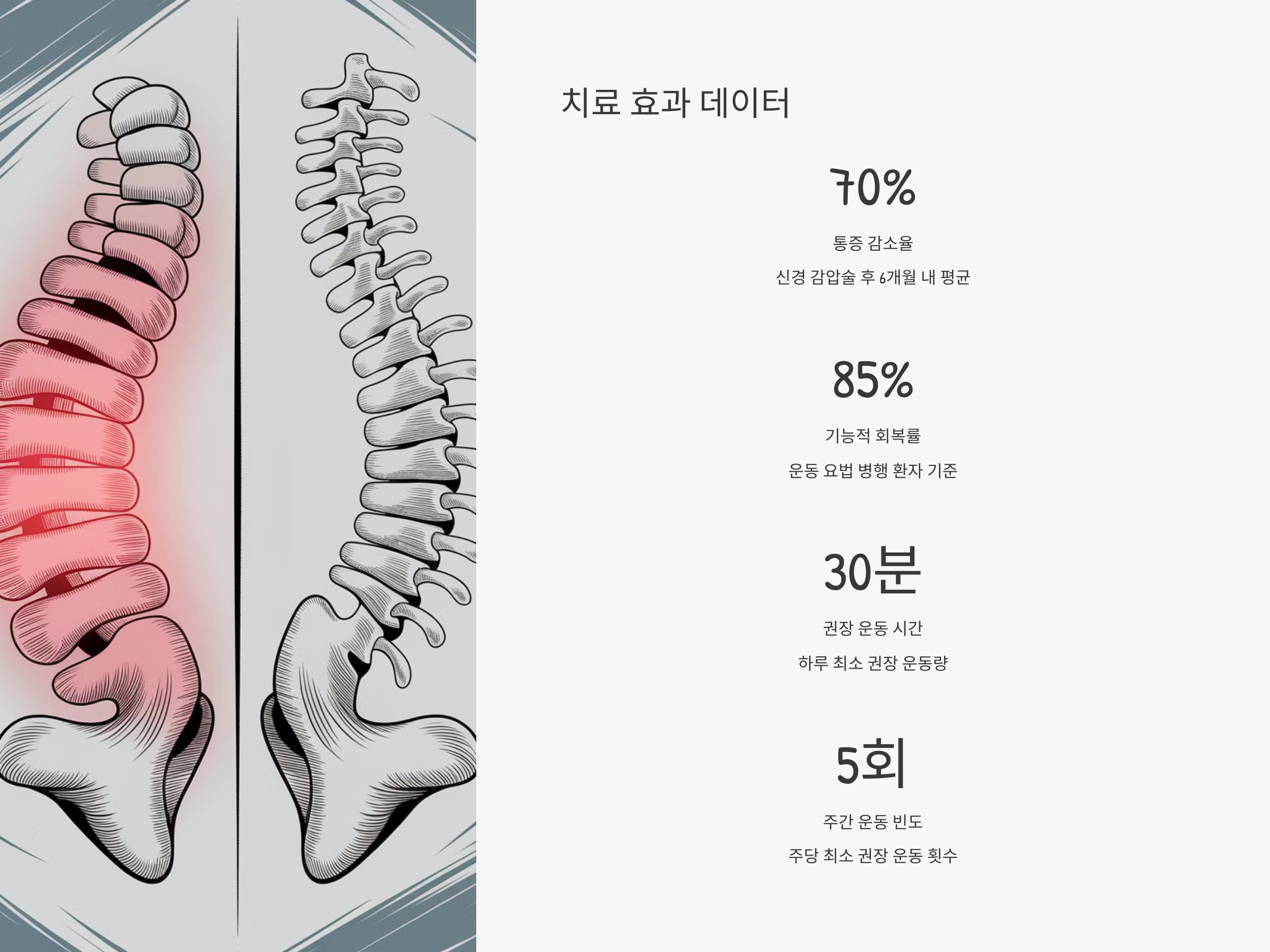 이 수술의 가장 큰 장점은 통증의 빠른 개선입니다. 감압술 후 즉각적으로 통증이 줄어드는 사례가 많고, 3일 이내 퇴원이 가능한 경우도 드물지 않습니다. 수술 후 회복률은 일반적으로 80~90%에 이르며, 수술 전보다 보행 기능이나 허리 움직임이 현저히 향상됩니다.