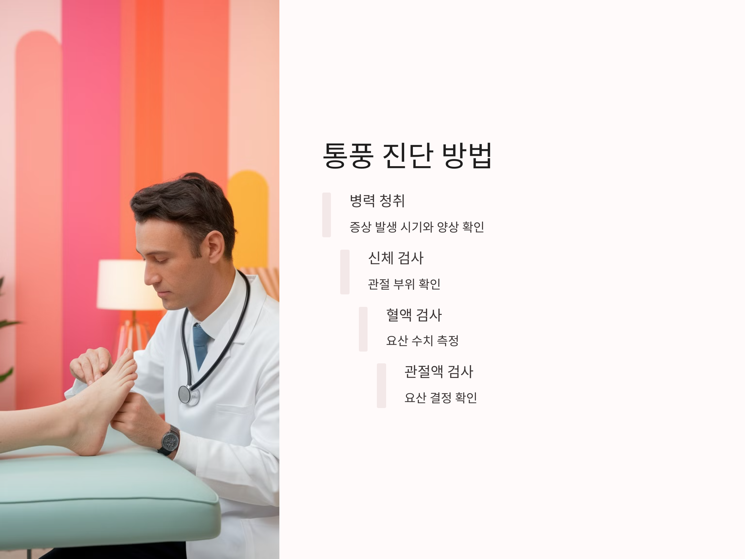 진단은 주로 병력 청취와 신체 검사를 통해 이루어지며, 혈액 검사에서 요산 수치를 측정하여 진단을 확정합니다. 또한, 관절에 침착된 요산 결정이 있는지 확인하기 위해 관절액을 채취하여 검사할 수도 있습니다.