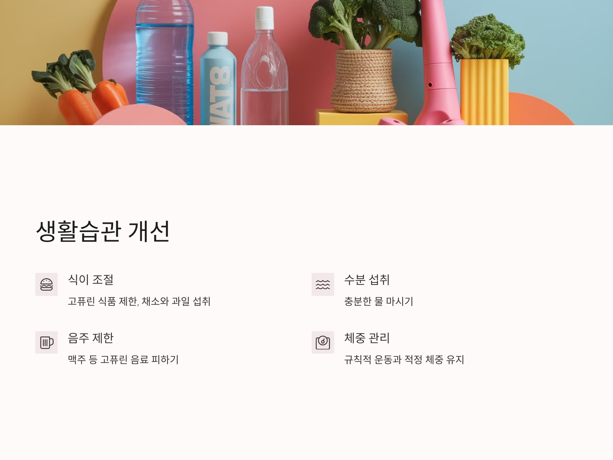 생활습관을 개선하는 것도 통풍 관리에 중요한 역할을 합니다. 첫째, 고퓨린 식품(예: 붉은 육류, 해산물 등)을 피하고, 채소와 과일을 많이 섭취하는 것이 좋습니다. 둘째, 과도한 음주를 피하고, 특히 맥주와 같은 고퓨린 음료는 피하는 것이 좋습니다. 셋째, 규칙적인 운동과 체중 관리는 요산 수치를 낮추는 데 도움이 됩니다.
