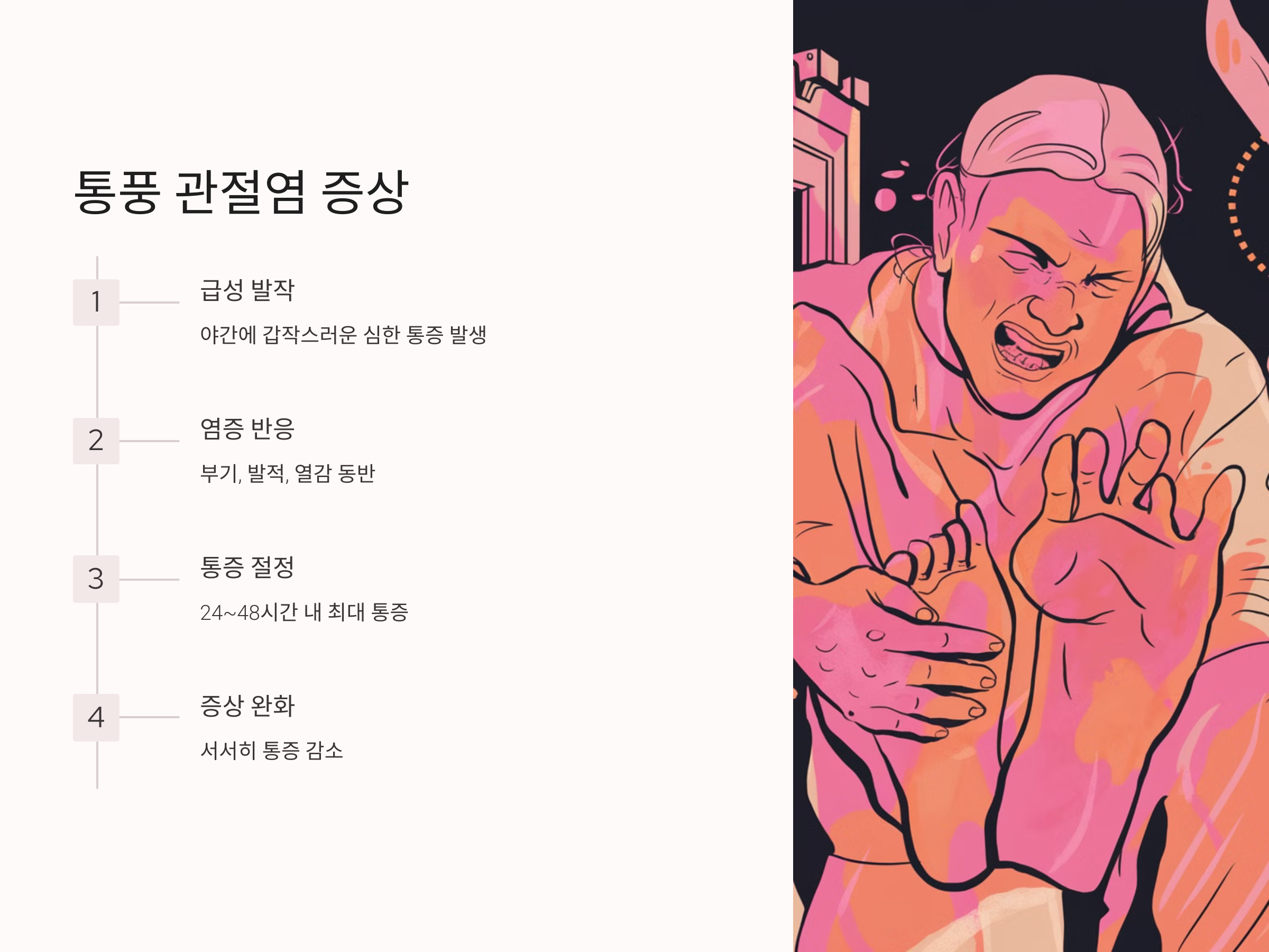 통풍 관절염은 대개 몇 가지 뚜렷한 증상으로 나타납니다. 첫째, 엄지발가락의 관절에서 갑작스러운 심한 통증이 시작됩니다. 둘째, 그 부위가 붓고 붉어지며, 따뜻해지는 증상이 동반됩니다. 셋째, 통증이 수시간에서 수일 내에 급격히 악화되기도 하며, 극심한 경우에는 움직임이 불가능할 정도로 고통스러울 수 있습니다.