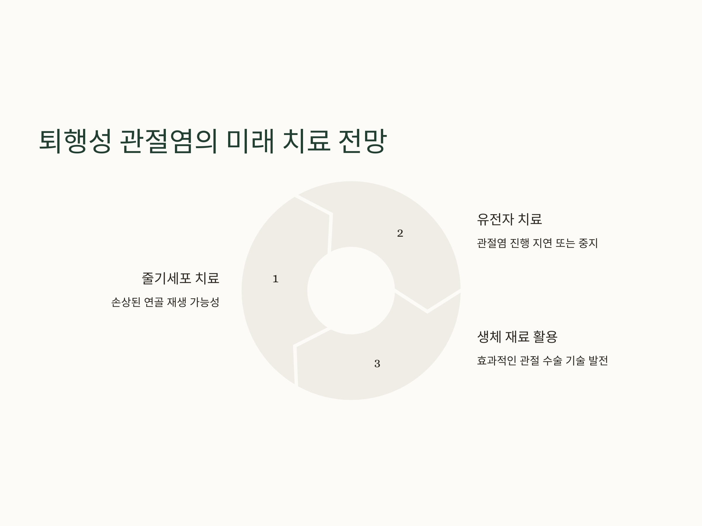 퇴행성 관절염의 치료법은 지속적으로 발전하고 있습니다. 현재 다양한 연구가 진행 중이며, 특히 줄기세포 치료와 유전자 치료 등이 주목받고 있습니다. 줄기세포 치료는 손상된 연골을 재생할 수 있는 가능성을 열어주고 있으며, 유전자 치료는 관절염의 진행을 늦추거나 중지시킬 수 있는 잠재력을 가지고 있습니다.