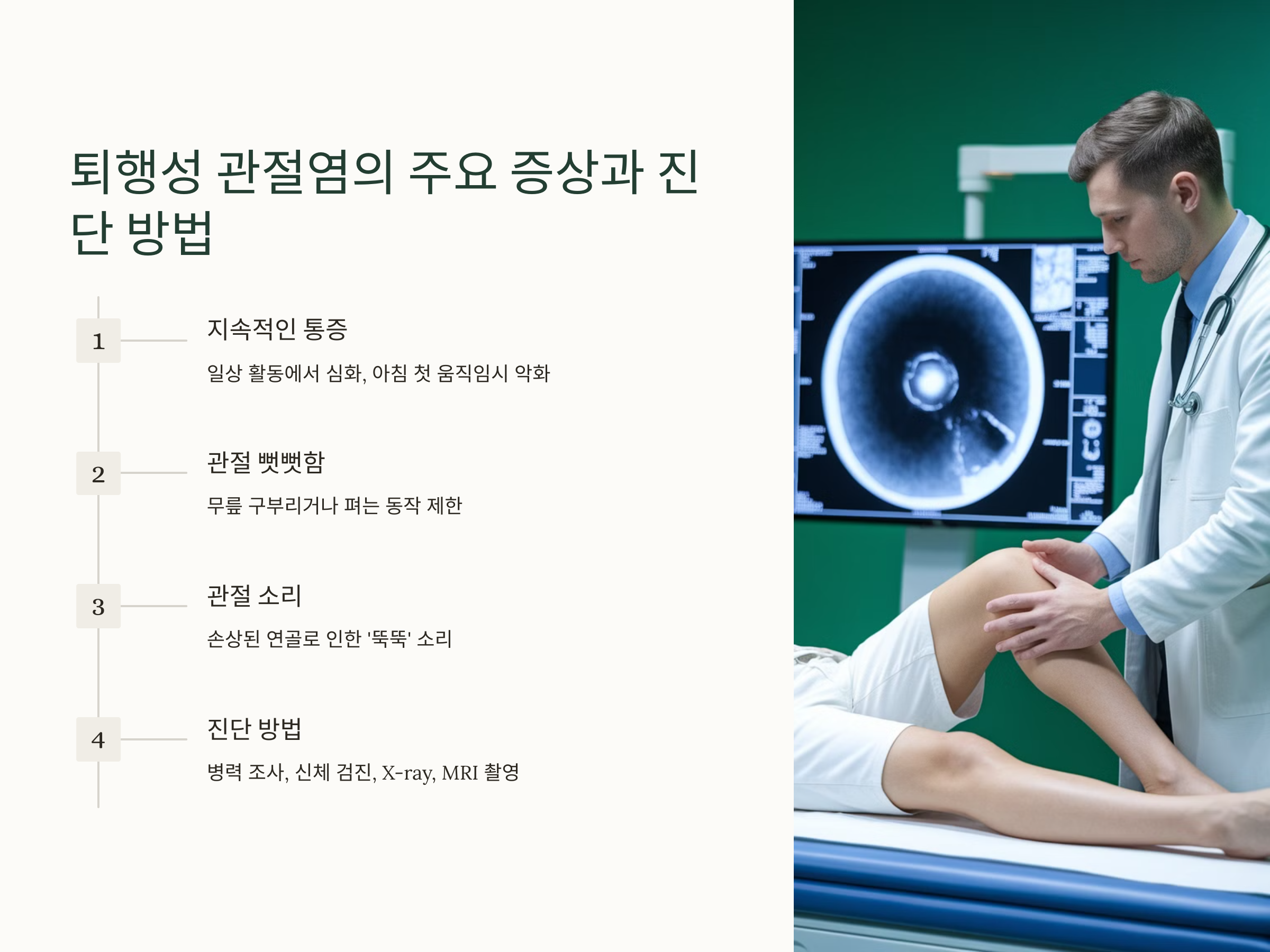 진단은 일반적으로 환자의 증상과 병력을 바탕으로 이루어집니다. 의사는 신체 검진을 통해 관절의 움직임을 체크하고, X-ray나 MRI 촬영을 통해 관절의 연골 손상 정도를 확인할 수 있습니다. 이러한 검사들은 퇴행성 관절염의 정도를 평가하고, 치료 계획을 세우는 데 중요한 정보를 제공합니다.