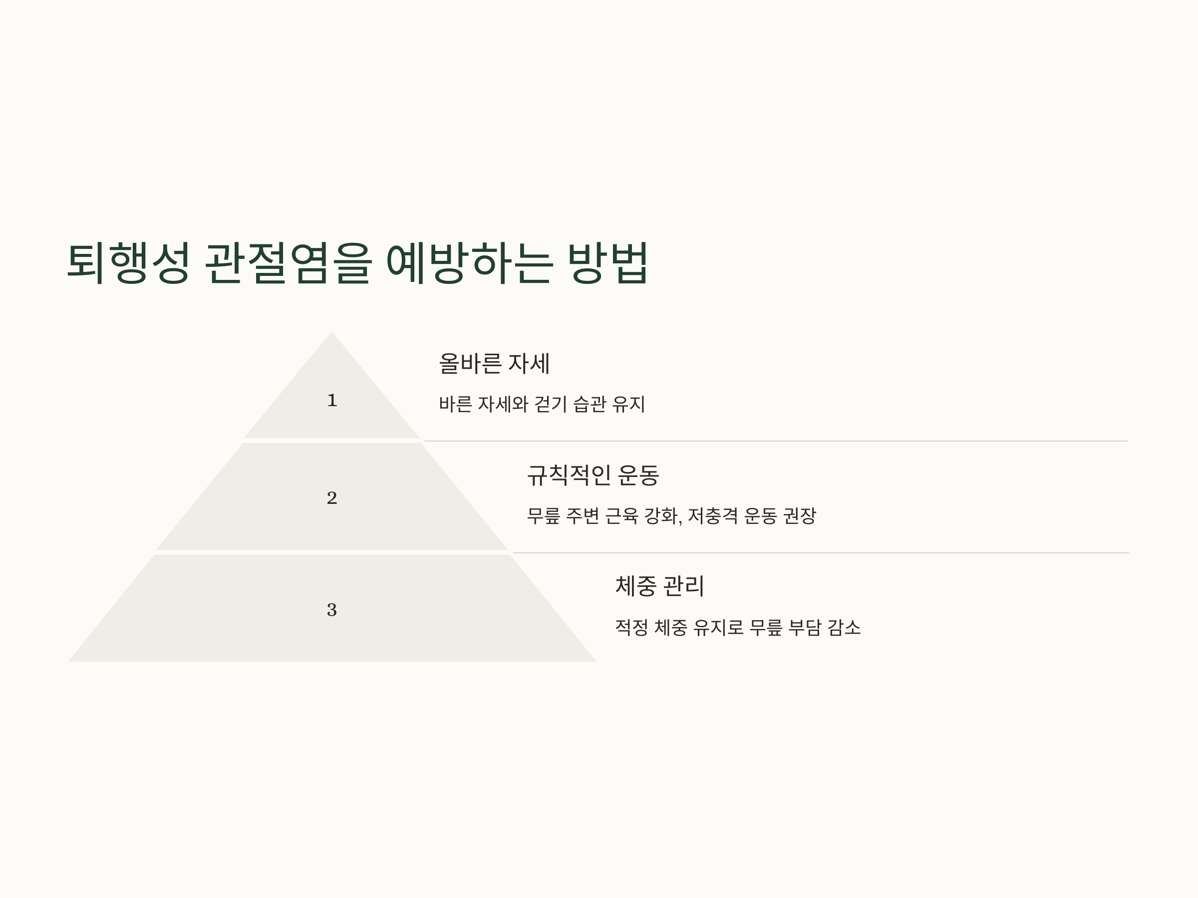 퇴행성 관절염은 완전히 예방하기는 어렵지만, 그 발병을 늦추거나 증상을 완화할 수 있는 방법은 존재합니다. 첫 번째로, 체중 관리가 중요합니다. 과체중이나 비만은 무릎에 과도한 압력을 가해 관절에 부담을 주기 때문에, 체중을 적정 수준으로 유지하는 것이 중요합니다.