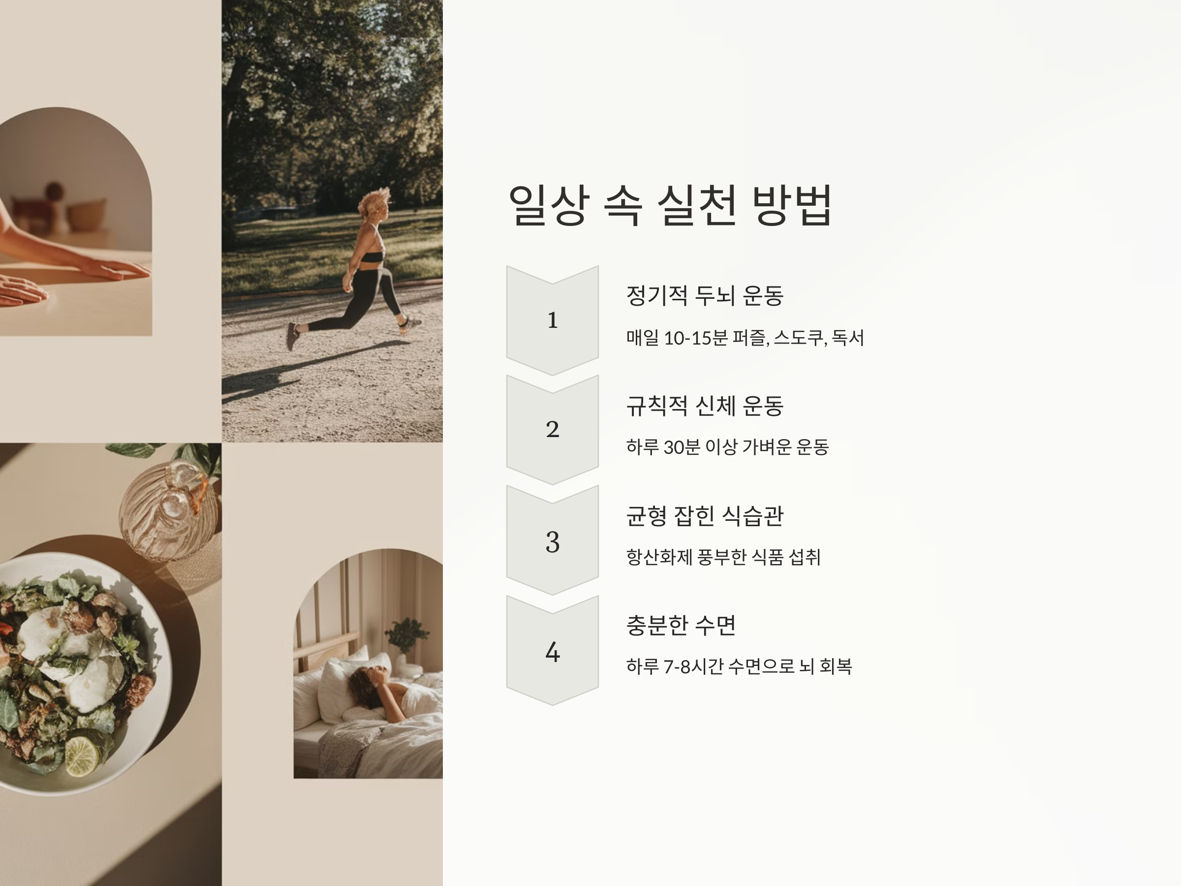 - 신경 세포 보호: 두뇌 운동은 뇌 세포의 성장과 복구를 돕습니다.