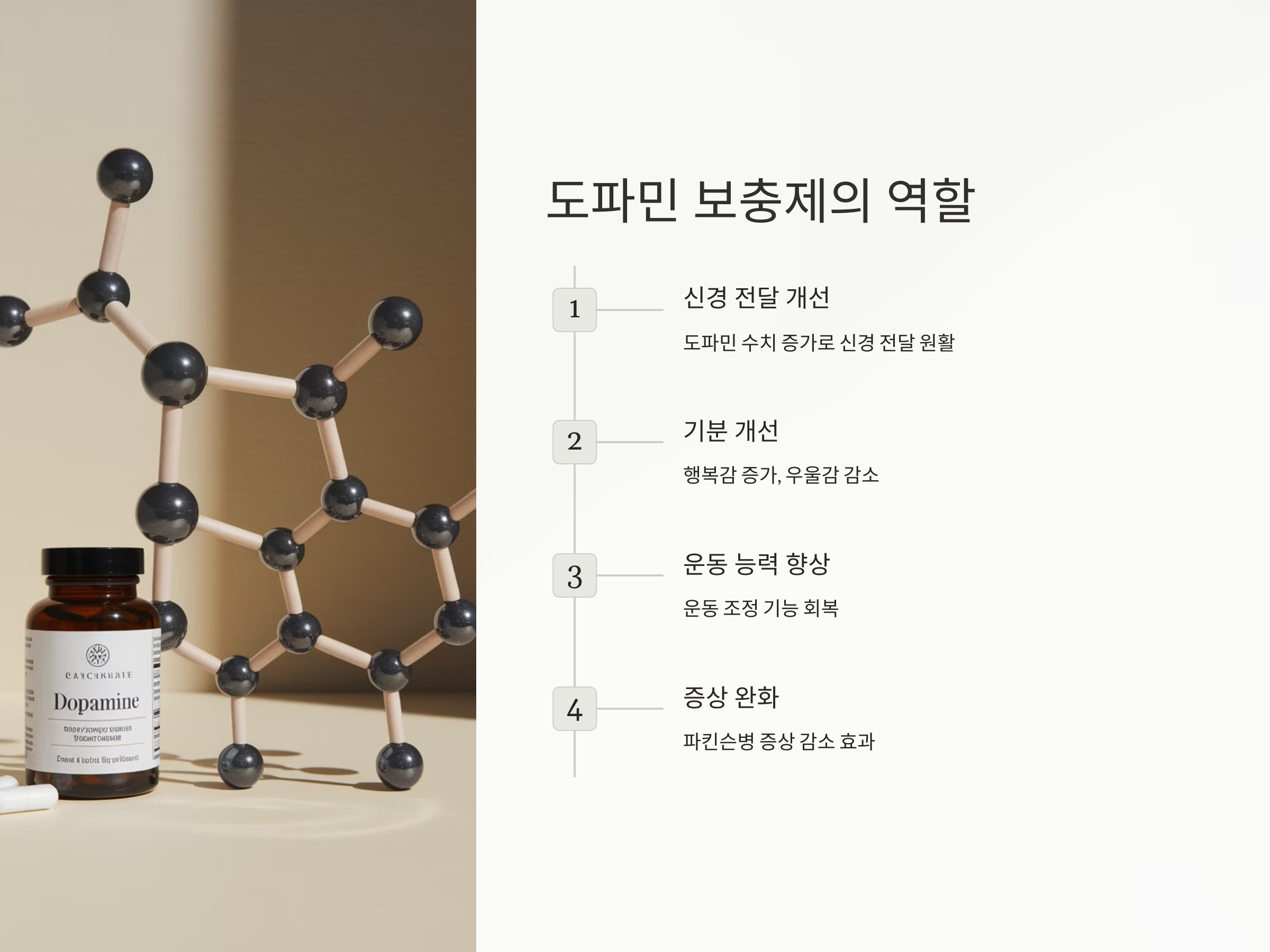 도파민은 뇌에서 중요한 역할을 하는 신경전달물질로, 운동, 기분, 집중력, 그리고 보상 시스템에 깊은 영향을 미칩니다. 파킨슨병 환자는 도파민 생성이 감소하기 때문에 증상이 발생하게 됩니다. 이에 도파민 보충제를 섭취하면 부족한 도파민을 보충하여 신경 세포 간의 전달을 돕고, 파킨슨병의 증상을 완화하는 데 도움을 줄 수 있습니다.