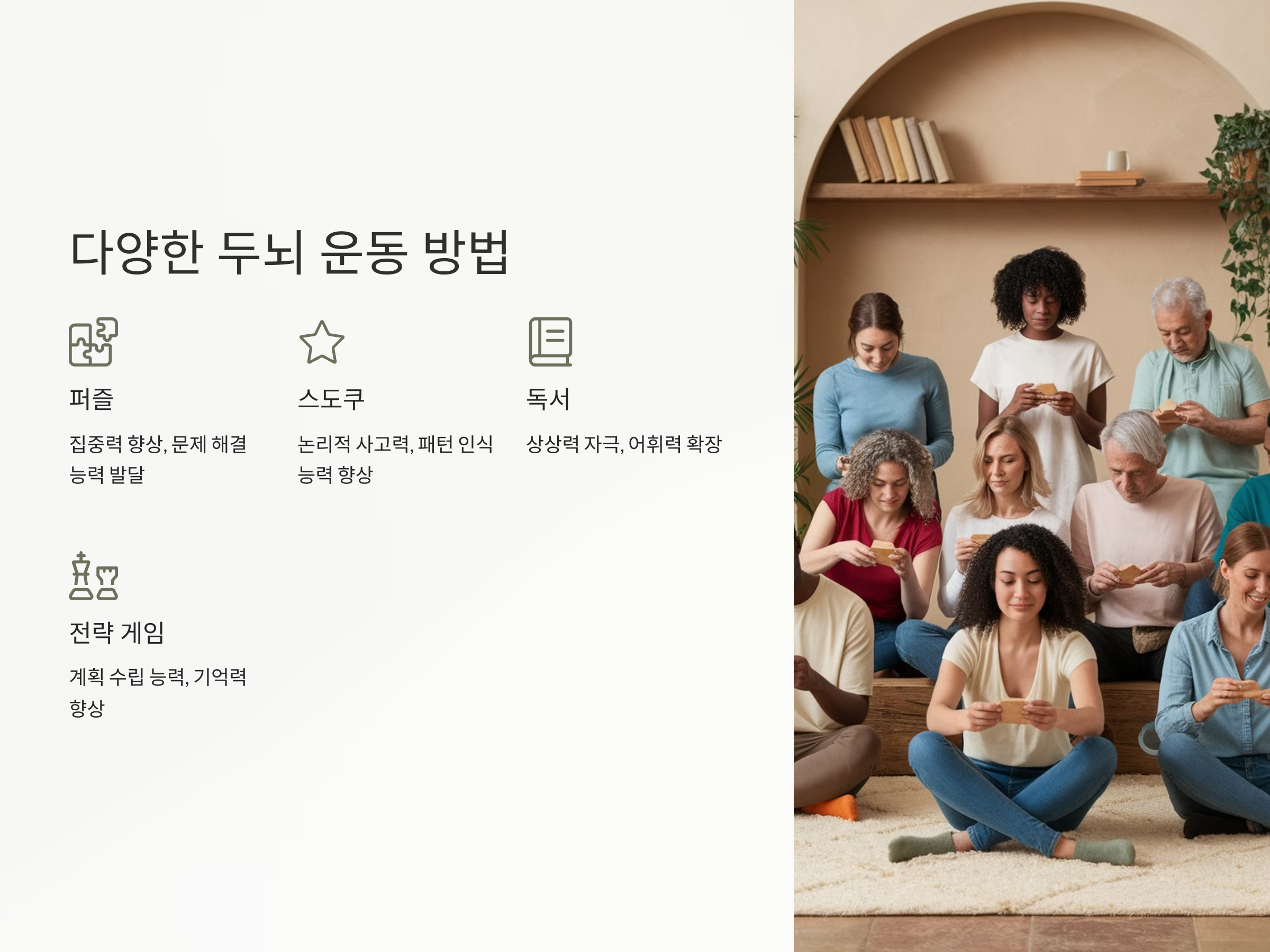 - 정기적인 두뇌 운동: 매일 10~15분 정도의 두뇌 운동을 통해 뇌를 자극합니다. 퍼즐, 스도쿠, 독서, 게임 등 다양한 방법을 활용하세요.