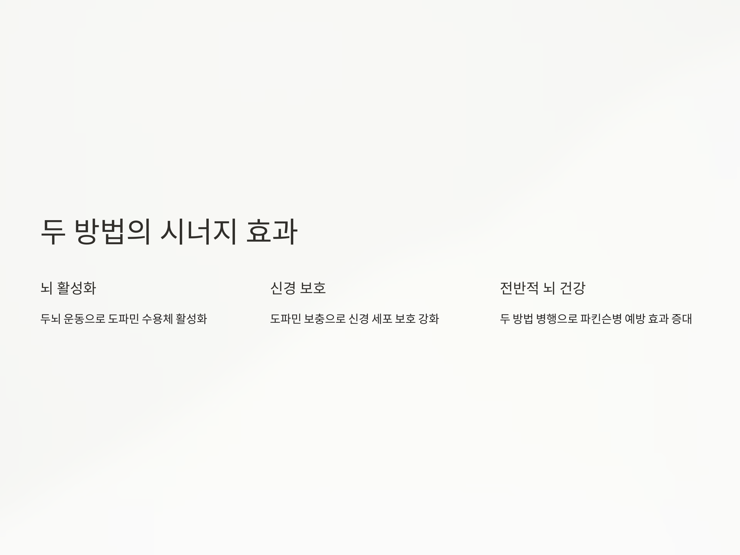 - 전반적인 뇌 건강 개선: 두 가지 방법을 병행하면 뇌의 전반적인 건강을 개선하고, 파킨슨병 예방에 더욱 효과적인 결과를 얻을 수 있습니다.