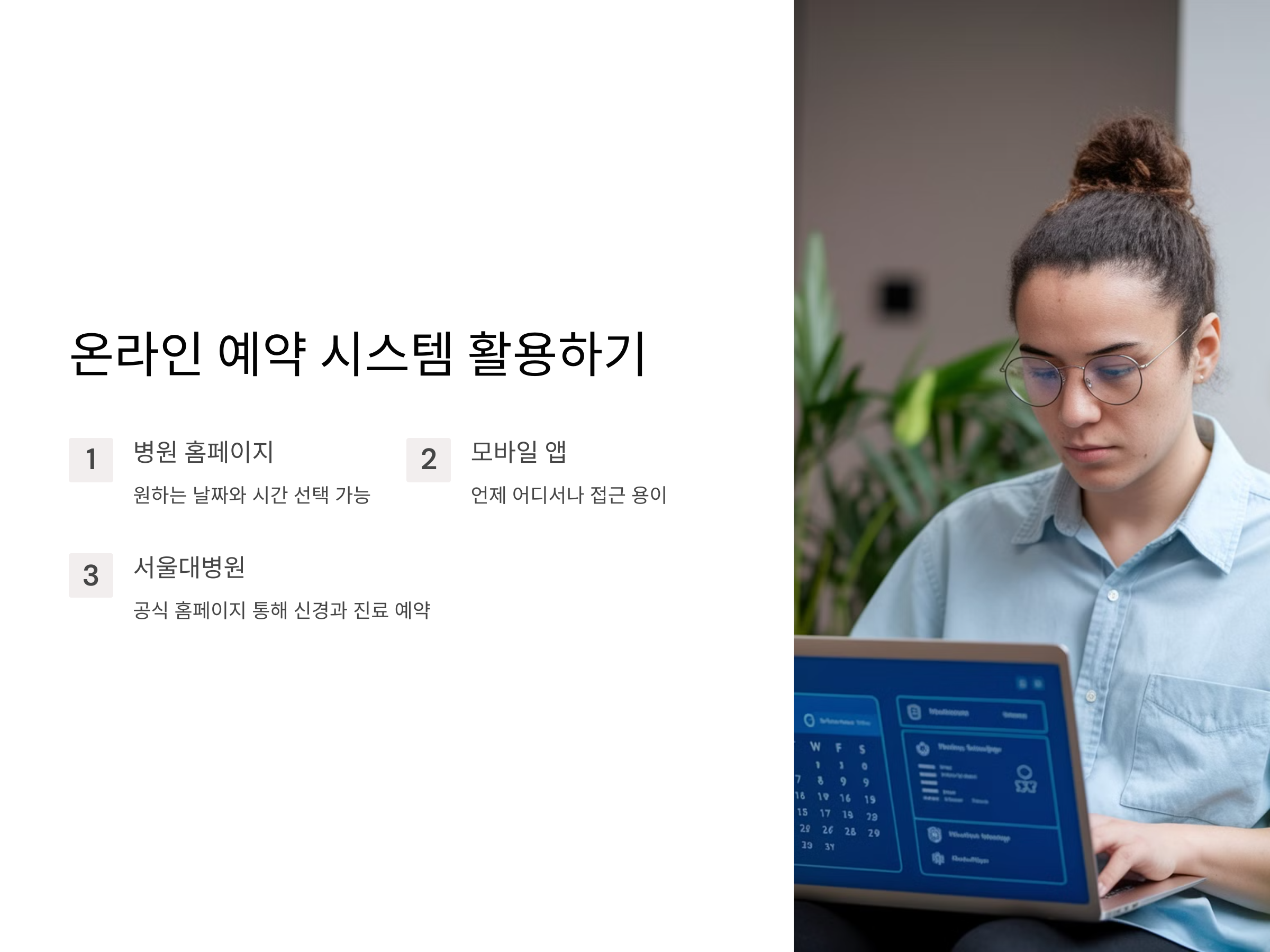 최근 많은 병원들이 온라인 예약 시스템을 도입하여 환자들이 편리하게 진료를 예약할 수 있도록 지원하고 있습니다. 이러한 시스템은 병원 홈페이지나 모바일 앱을 통해 접근할 수 있으며, 원하는 날짜와 시간을 선택하여 예약할 수 있습니다. 예를 들어, 서울대학교병원은 공식 홈페이지를 통해 신경과 진료 예약을 받고 있습니다. citeturn0search8