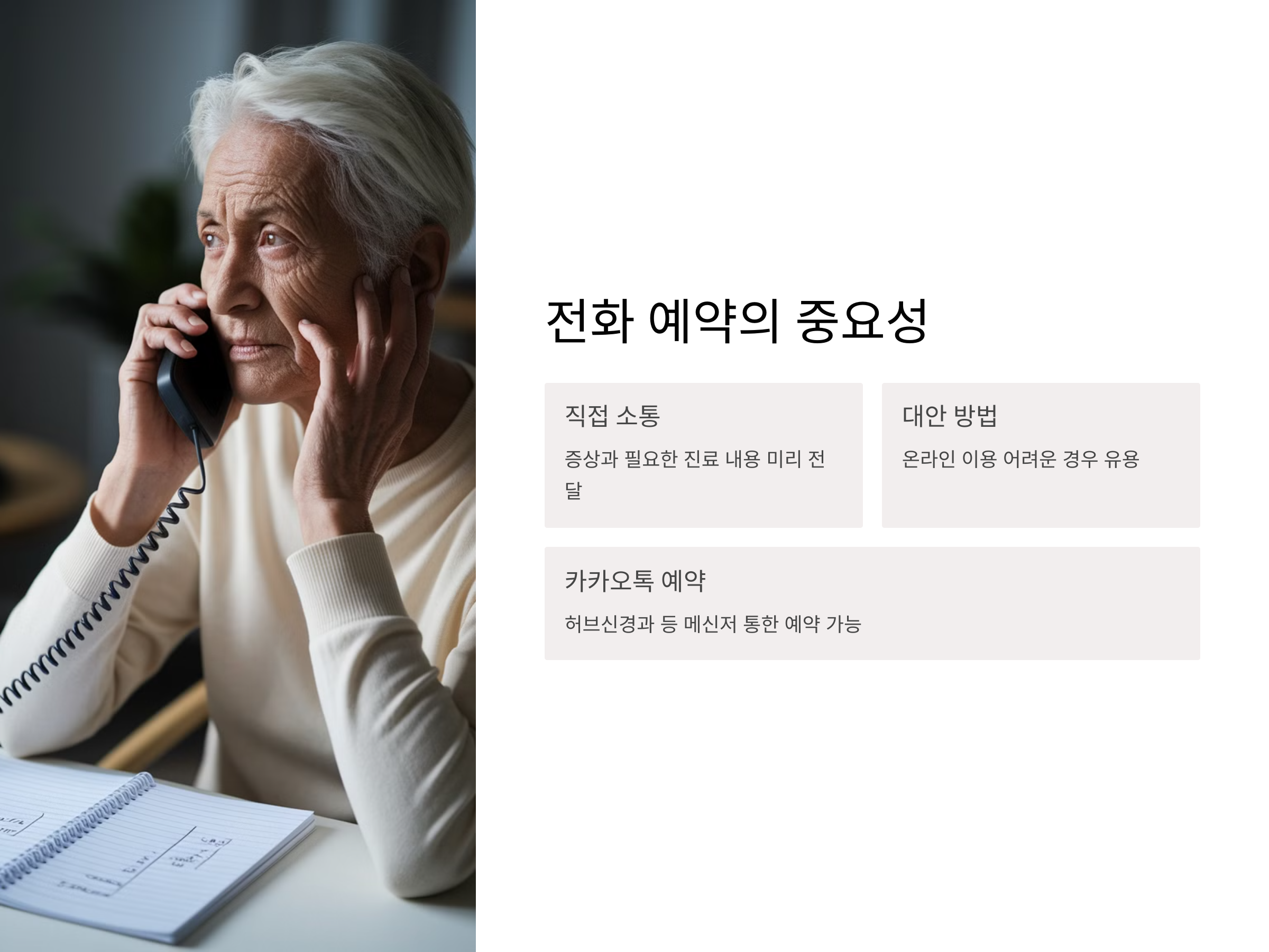 온라인 시스템을 이용하기 어려운 경우, 전화 예약도 유용한 방법입니다. 병원에 직접 전화하여 신경과 진료를 예약할 수 있으며, 이때 증상과 필요한 진료 내용을 미리 전달하면 예약 과정이 더욱 원활해집니다. 예를 들어, 허브신경과는 카카오톡을 통한 예약을 받고 있으며, 이를 통해 환자들의 편의를 도모하고 있습니다. citeturn0search5