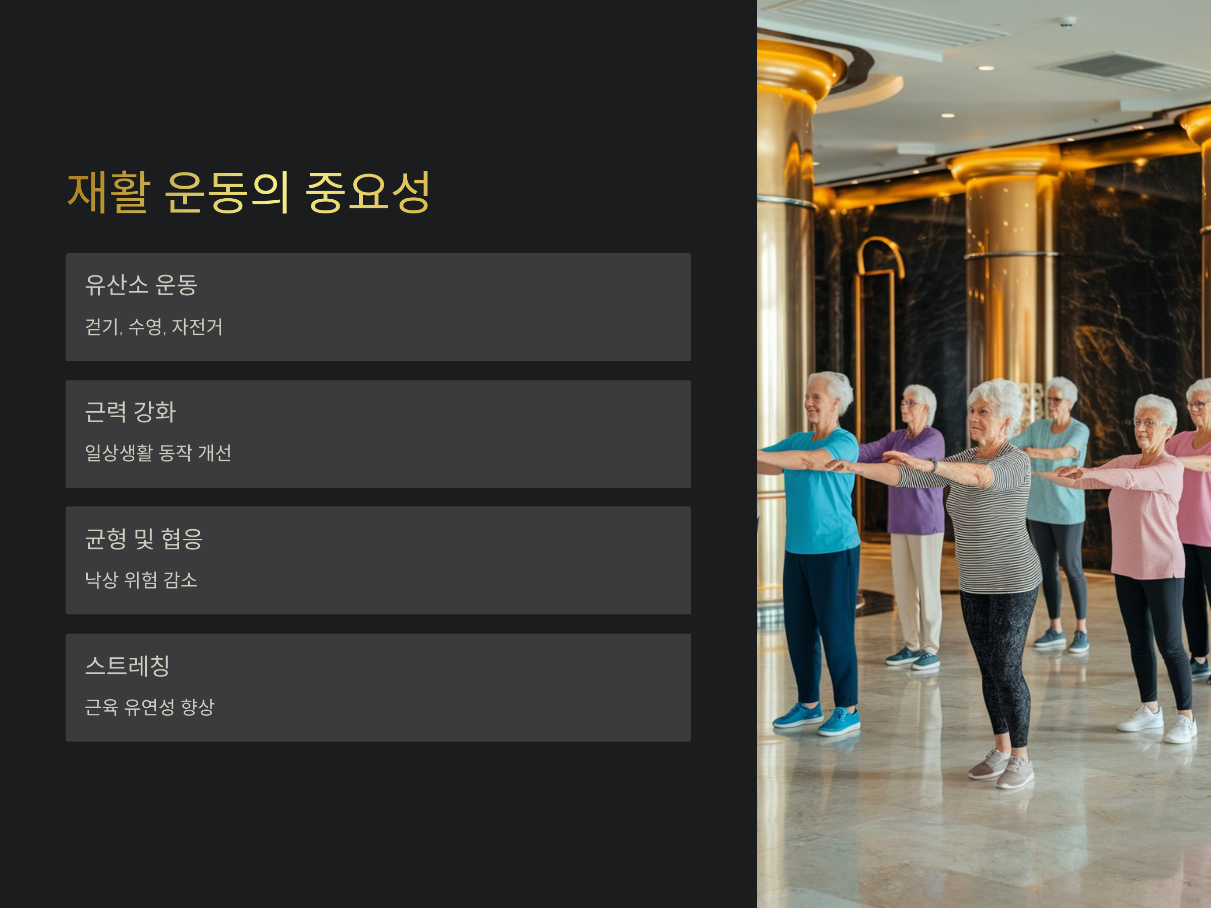 - 근력 강화 운동: 근육의 힘을 높여 일상생활 동작을 원활하게 수행할 수 있도록 도와줍니다.