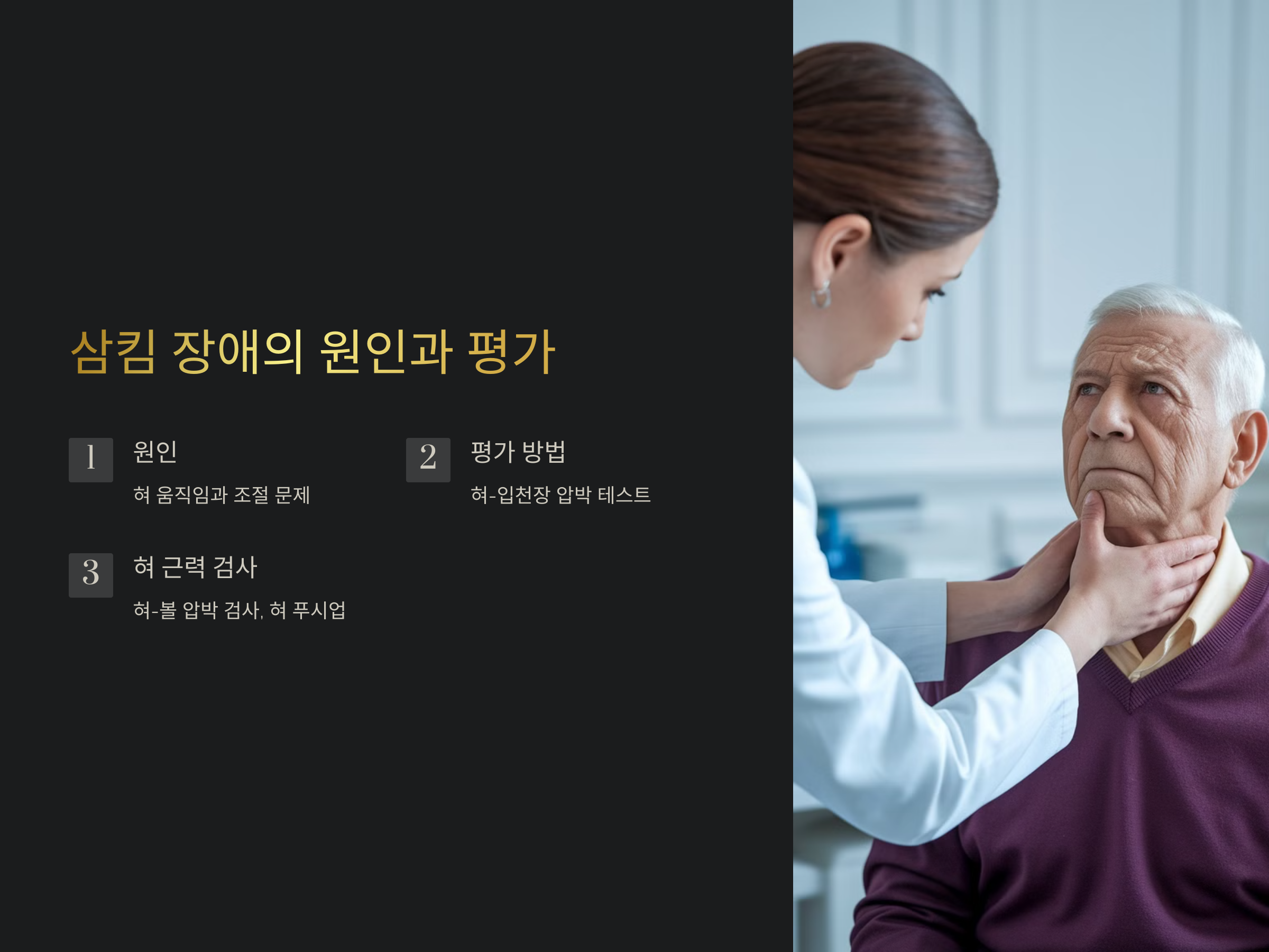 - 혀-입천장 압박 테스트: 입을 다물고 혀를 입천장에 강하게 밀어붙여 얼마나 오래 유지할 수 있는지를 평가합니다. 이는 혀 근력을 주관적으로 판단하는 데 도움이 됩니다.