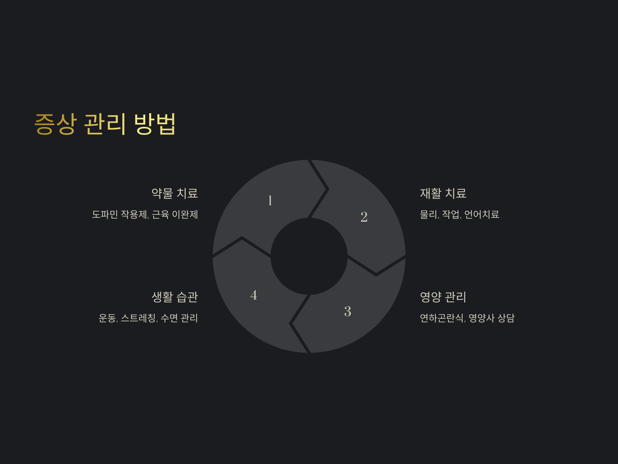 - 약물 치료: 도파민 작용제나 근육 이완제 등을 통해 증상을 완화할 수 있습니다. 약물 치료는 전문의와의 상담을 통해 적절한 처방이 이루어져야 합니다.