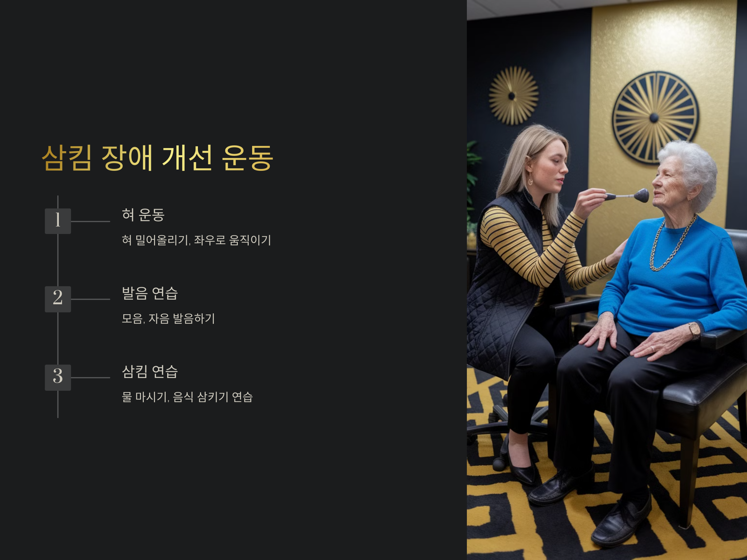 - 재활 치료: 물리치료, 작업치료, 언어치료 등을 통해 근육의 유연성을 높이고 삼킴 기능을 향상시킬 수 있습니다. 특히 혀 운동과 발음 연습은 삼킴 장애 개선에 도움이 됩니다.