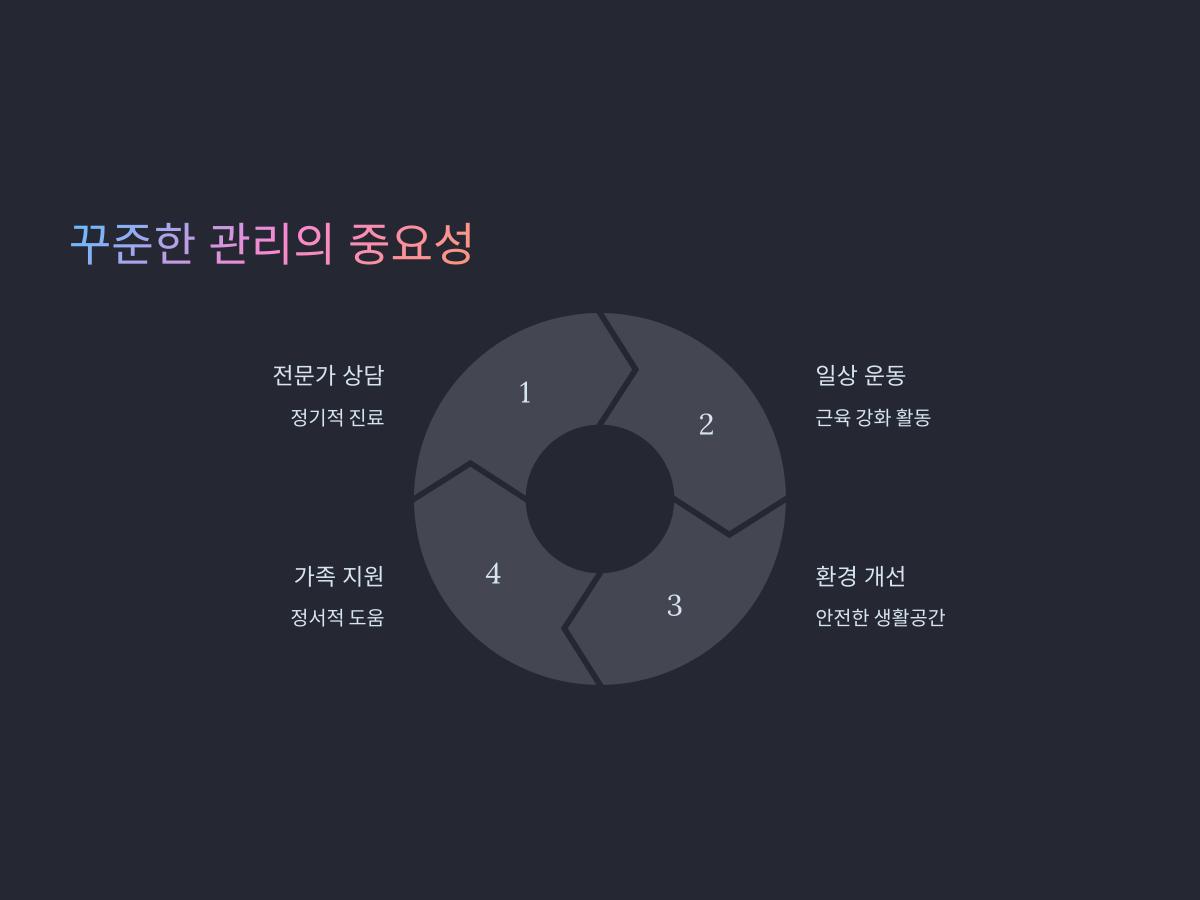 매일 간단한 운동을 통해 근육을 강화하고 유연성을 높이는 것이 좋습니다. 물리치료는 근육의 경직을 완화시키고, 보행 능력을 개선하는 데 효과적입니다. 환자에게 맞는 운동 프로그램을 통해 일상적인 활동을 보다 원활하게 할 수 있습니다.