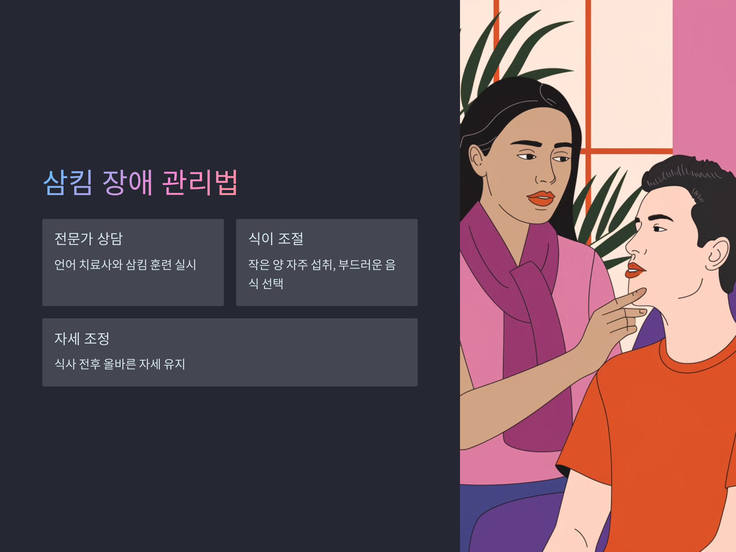 환자에게는 음식을 고르고, 삼키기 쉬운 상태로 준비하는 것이 중요합니다. 부드러운 음식이나 식사 전후의 자세 조정도 삼킴을 돕는 방법입니다.