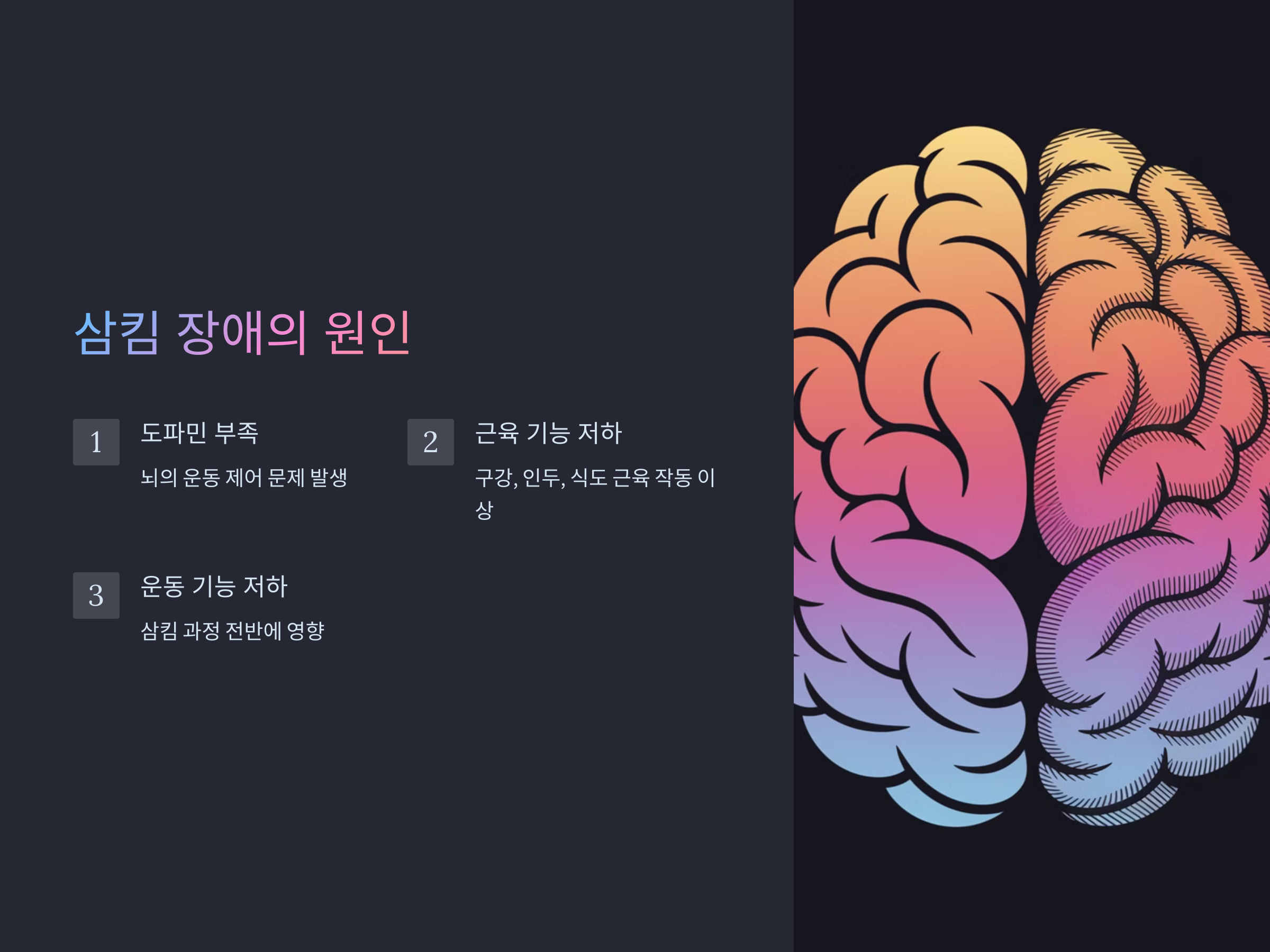 삼킴 장애는 파킨슨병으로 인해 발생하는 운동 기능의 저하와 관련이 깊습니다. 파킨슨병은 도파민이라는 신경전달물질의 부족으로 인해, 뇌의 운동 제어에 문제가 발생합니다. 이로 인해 구강, 인두, 식도 등 삼킴에 중요한 역할을 하는 근육들이 정상적으로 작동하지 않게 되어 음식을 삼키는 데 어려움을 겪습니다.