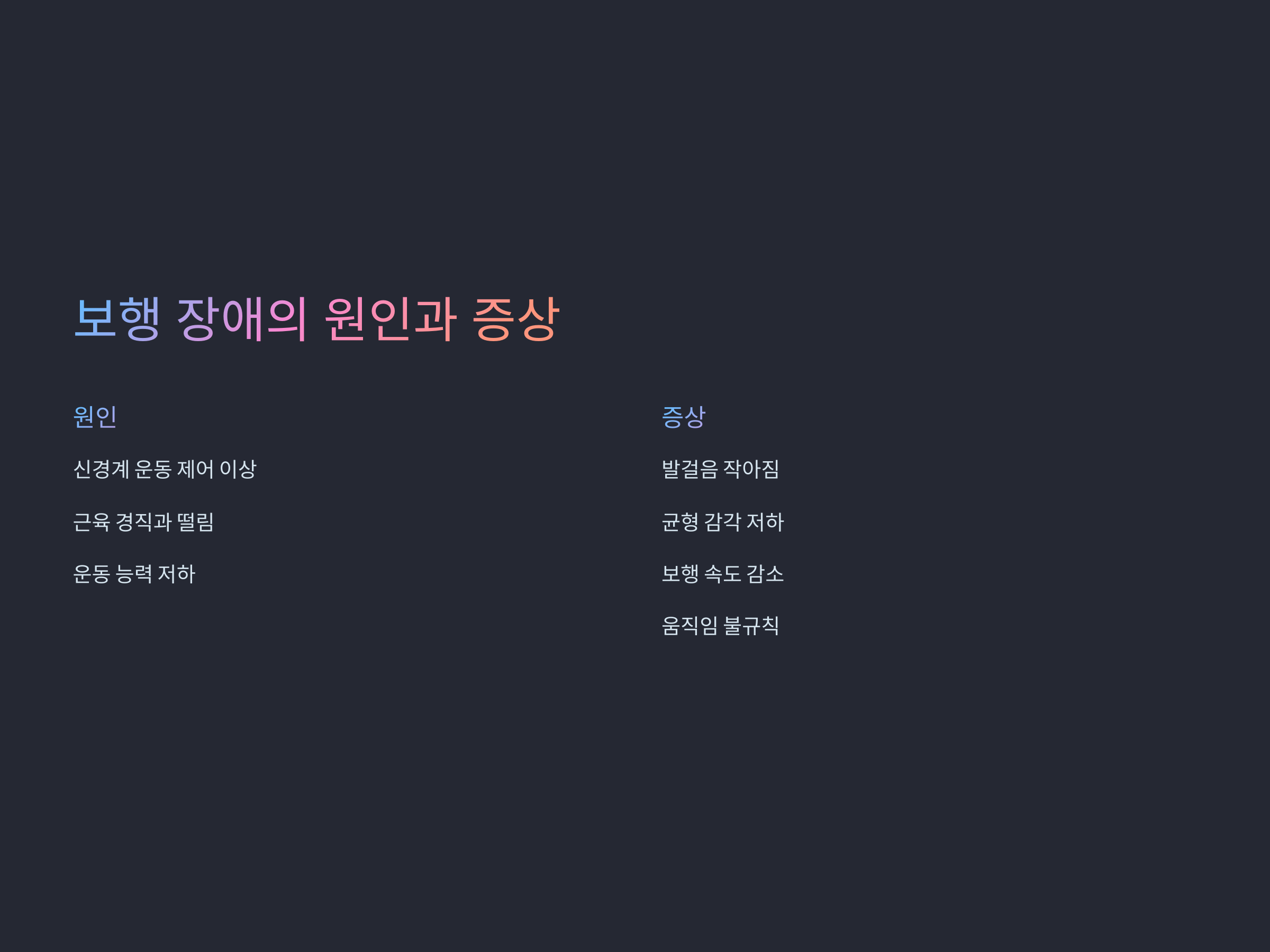 - 보행 속도가 느려지고, 멈추거나 갑자기 움직이지 못하는 경우
