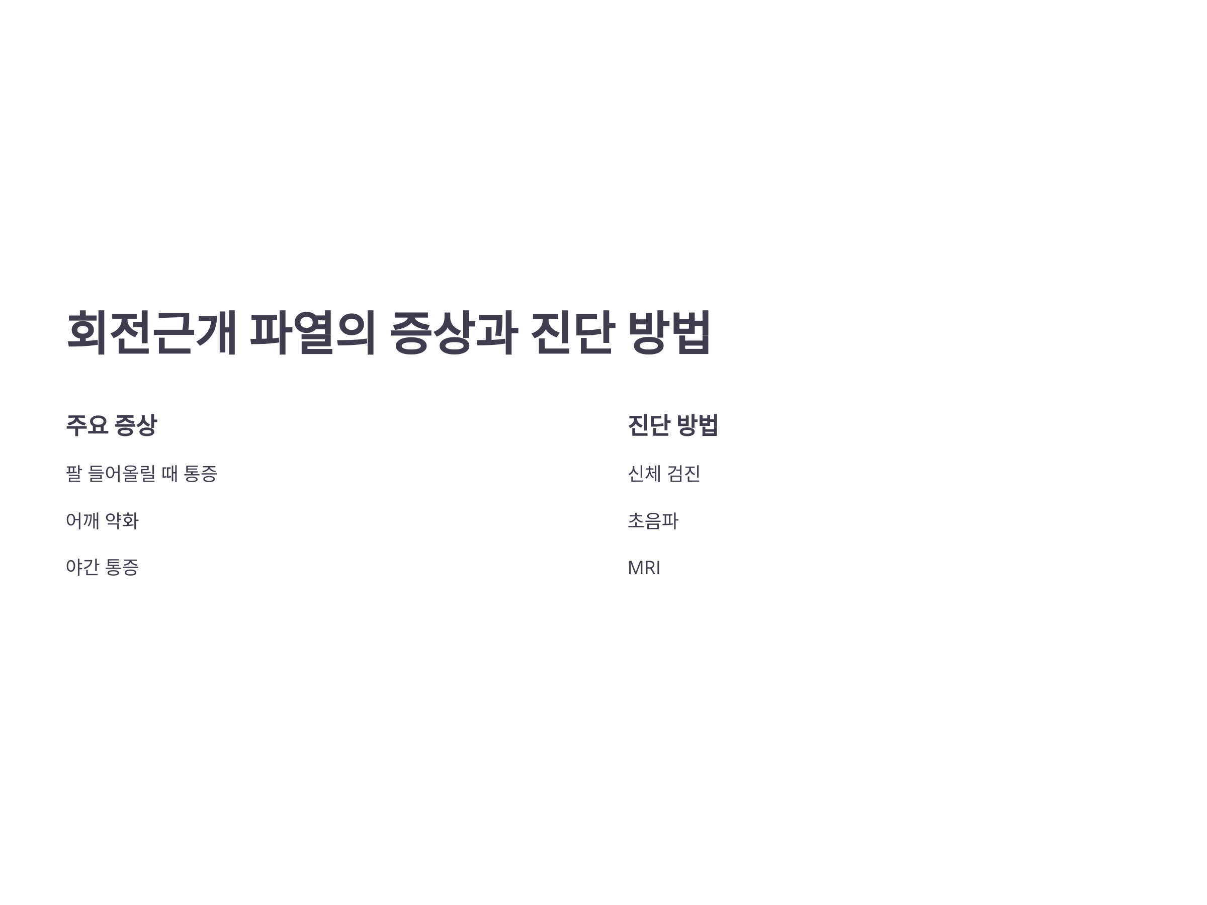 회전근개 파열의 주요 증상으로는 팔을 들어올릴 때의 통증, 어깨의 약화, 야간 통증 등이 있습니다. 이러한 증상이 지속되거나 악화된다면 전문의와 상담하여 정확한 진단을 받는 것이 중요합니다. 진단 방법으로는 신체 검진, 초음파, MRI 등이 활용됩니다.