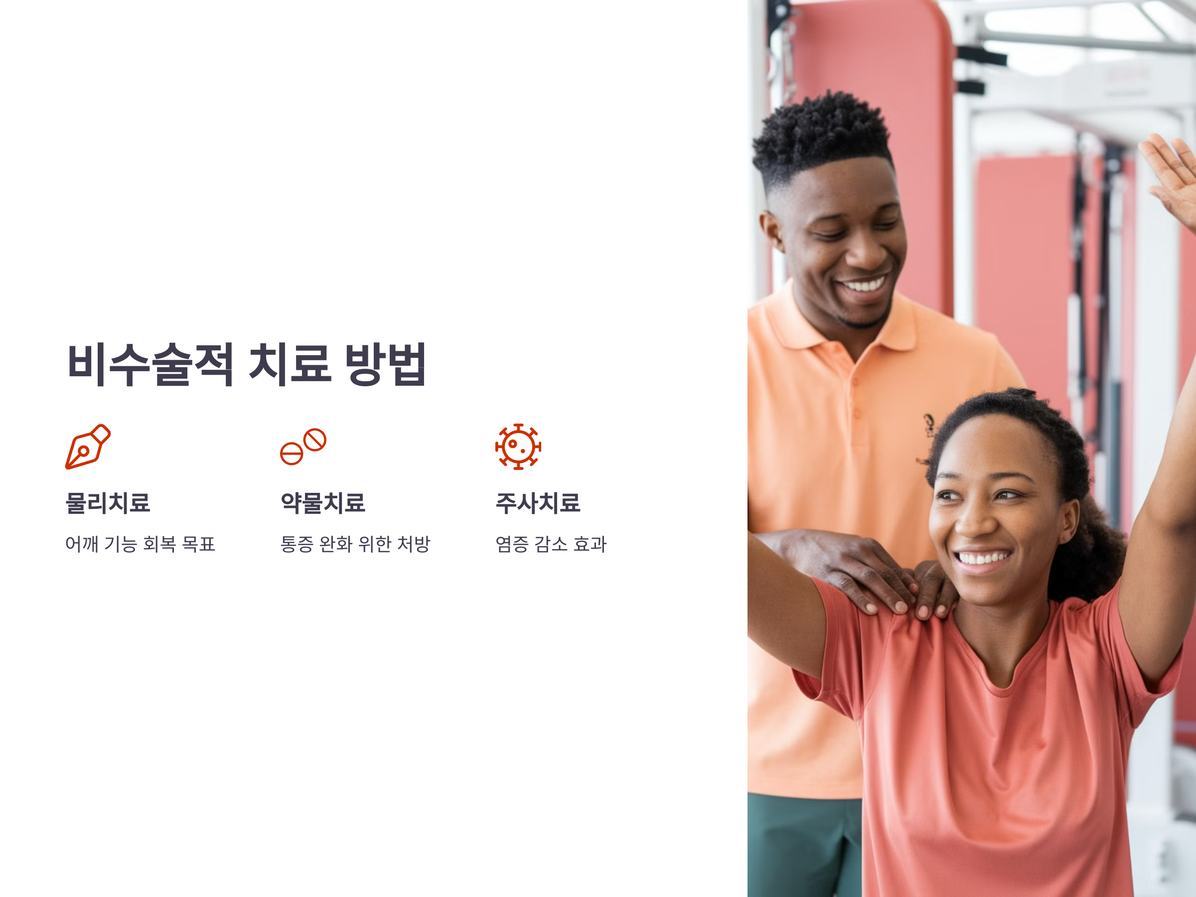 회전근개 파열의 치료는 손상의 정도와 환자의 상태에 따라 다릅니다. 경미한 경우에는 비수술적 치료가 우선적으로 고려됩니다. 물리치료, 약물치료, 주사치료 등이 이에 해당하며, 통증 완화와 기능 회복을 목표로 합니다.