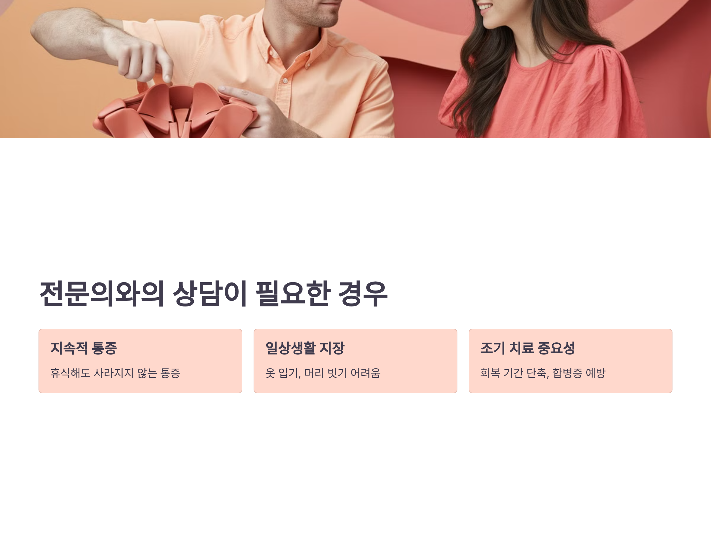 어깨 통증이 지속되거나 일상생활에 지장을 주는 경우, 전문의와 상담하여 정확한 진단과 적절한 치료를 받는 것이 중요합니다. 조기에 치료를 시작하면 회복 기간을 단축하고 합병증을 예방할 수 있습니다.