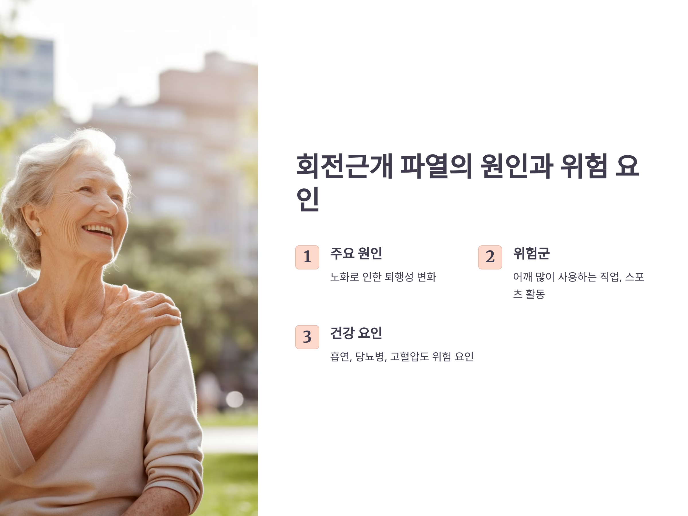 회전근개 파열은 다양한 원인으로 발생할 수 있습니다. 주된 원인으로는 노화로 인한 퇴행성 변화, 반복적인 어깨 사용, 외상 등이 있습니다. 특히, 어깨를 많이 사용하는 직업이나 스포츠 활동을 하는 사람들은 위험이 높습니다. 또한, 흡연, 당뇨병, 고혈압 등도 회전근개 파열의 위험 요인으로 알려져 있습니다.