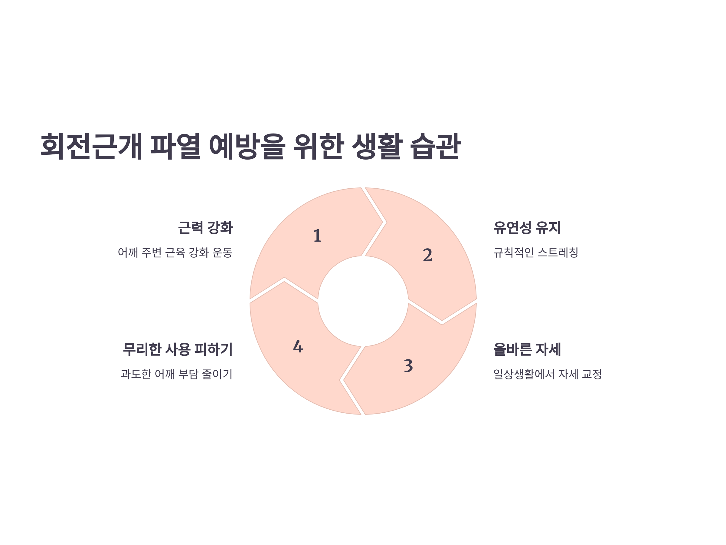 회전근개 파열을 예방하기 위해서는 어깨 근력을 강화하고 유연성을 유지하는 것이 중요합니다. 규칙적인 스트레칭과 근력 강화 운동을 통해 어깨 주변 근육을 강화할 수 있습니다. 또한, 올바른 자세를 유지하고, 무리한 어깨 사용을 피하는 것이 도움이 됩니다.