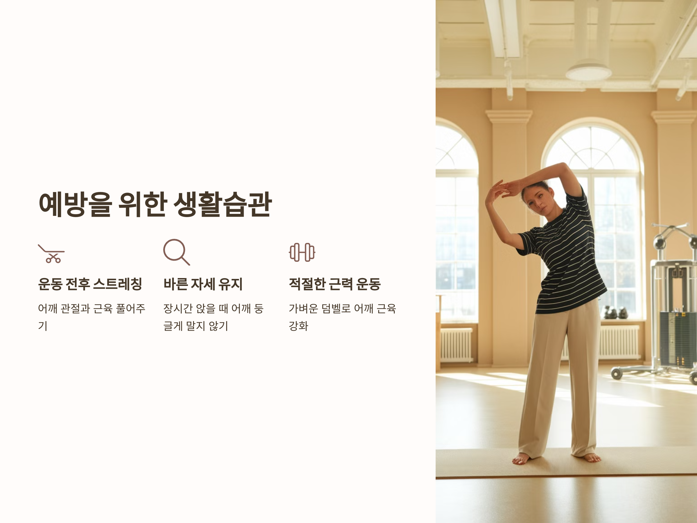 - 적절한 근력 운동: 가벼운 덤벨 운동으로 어깨 근육 강화