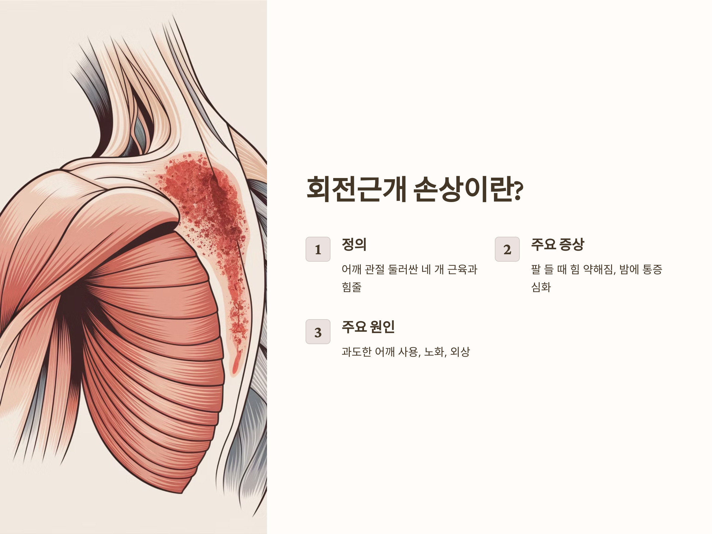 회전근개는 어깨 관절을 둘러싸고 있는 네 개의 근육과 힘줄을 의미하며, 팔을 들거나 회전하는 역할을 합니다. 이 부위가 손상되면 힘줄이 찢어지거나 염증이 생기면서 어깨 움직임이 제한되고 통증이 발생할 수 있습니다. 특히, 팔을 들 때 힘이 약해지거나 밤에 통증이 심해지는 특징이 있습니다.