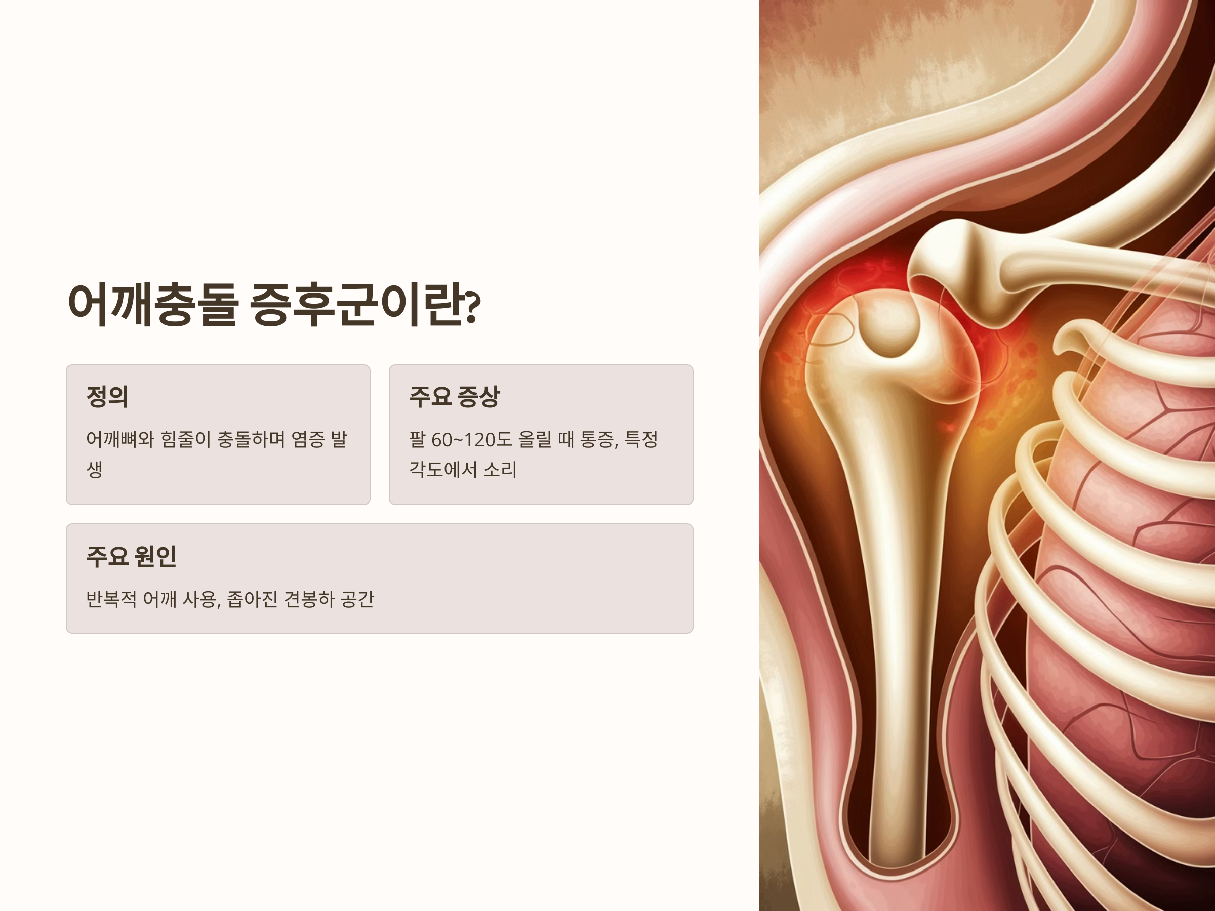 어깨충돌 증후군은 어깨뼈(견봉)와 힘줄(회전근개)이 충돌하면서 염증이 발생하는 질환입니다. 특히, 팔을 올릴 때 어깨 앞쪽이나 옆쪽에서 통증이 발생하는 경우가 많으며, 특정 각도에서 소리가 날 수 있습니다. 이 증후군은 장기간 방치하면 회전근개 손상으로 발전할 가능성이 있습니다.