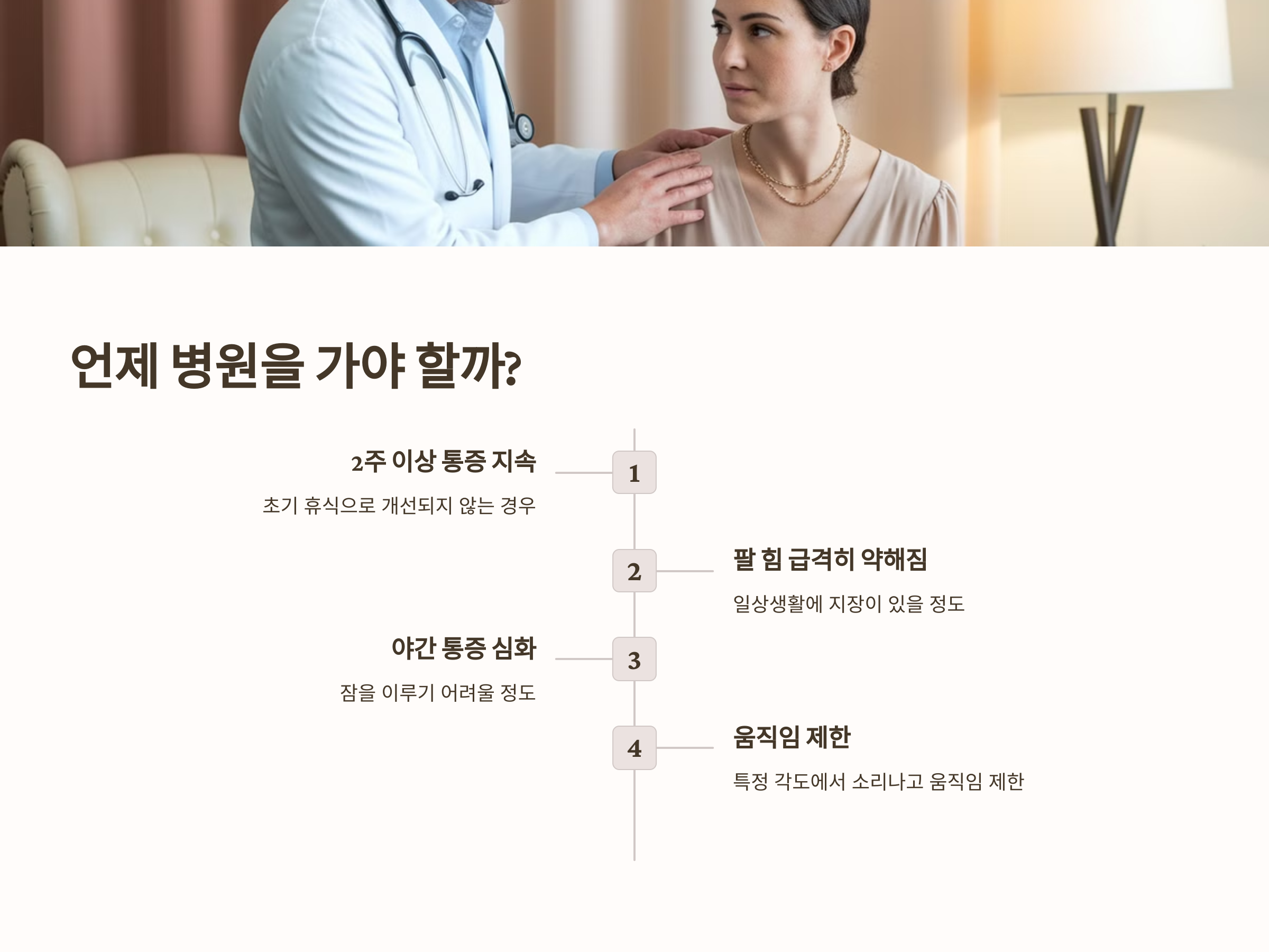 팔을 올릴 때 어깨에서 소리가 나고 통증이 지속된다면 단순한 피로가 아니라 회전근개 손상 또는 어깨충돌 증후군일 가능성이 높습니다. 초기에는 간단한 치료로 개선될 수 있지만, 방치하면 만성화되거나 수술이 필요할 수도 있습니다. 따라서, 다음과 같은 경우 병원 방문이 필수적입니다.