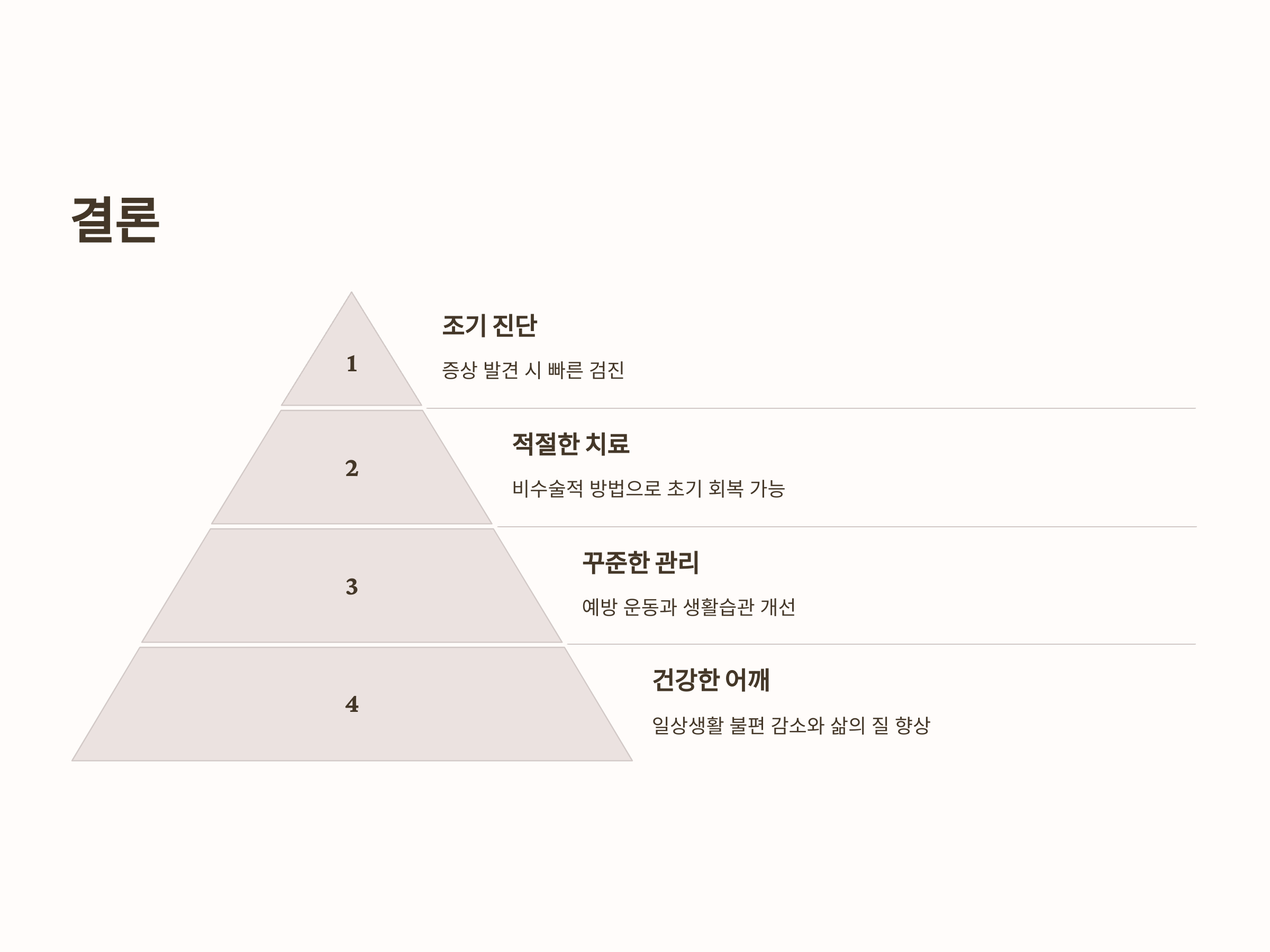 적절한 치료와 재활을 통해 어깨 건강을 지키고 일상생활의 불편을 줄이는 것이 중요합니다.