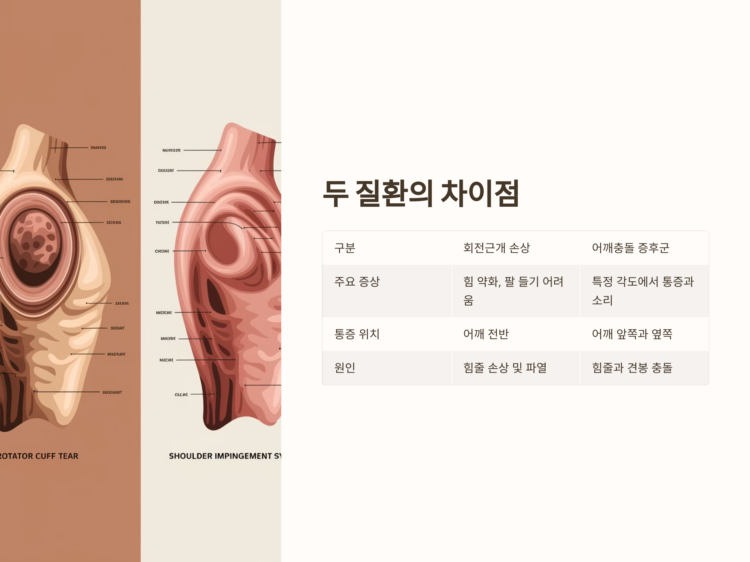 | 주요 증상 | 힘이 약해지고 팔을 들기 어려움 | 특정 각도에서 통증과 소리 발생 |