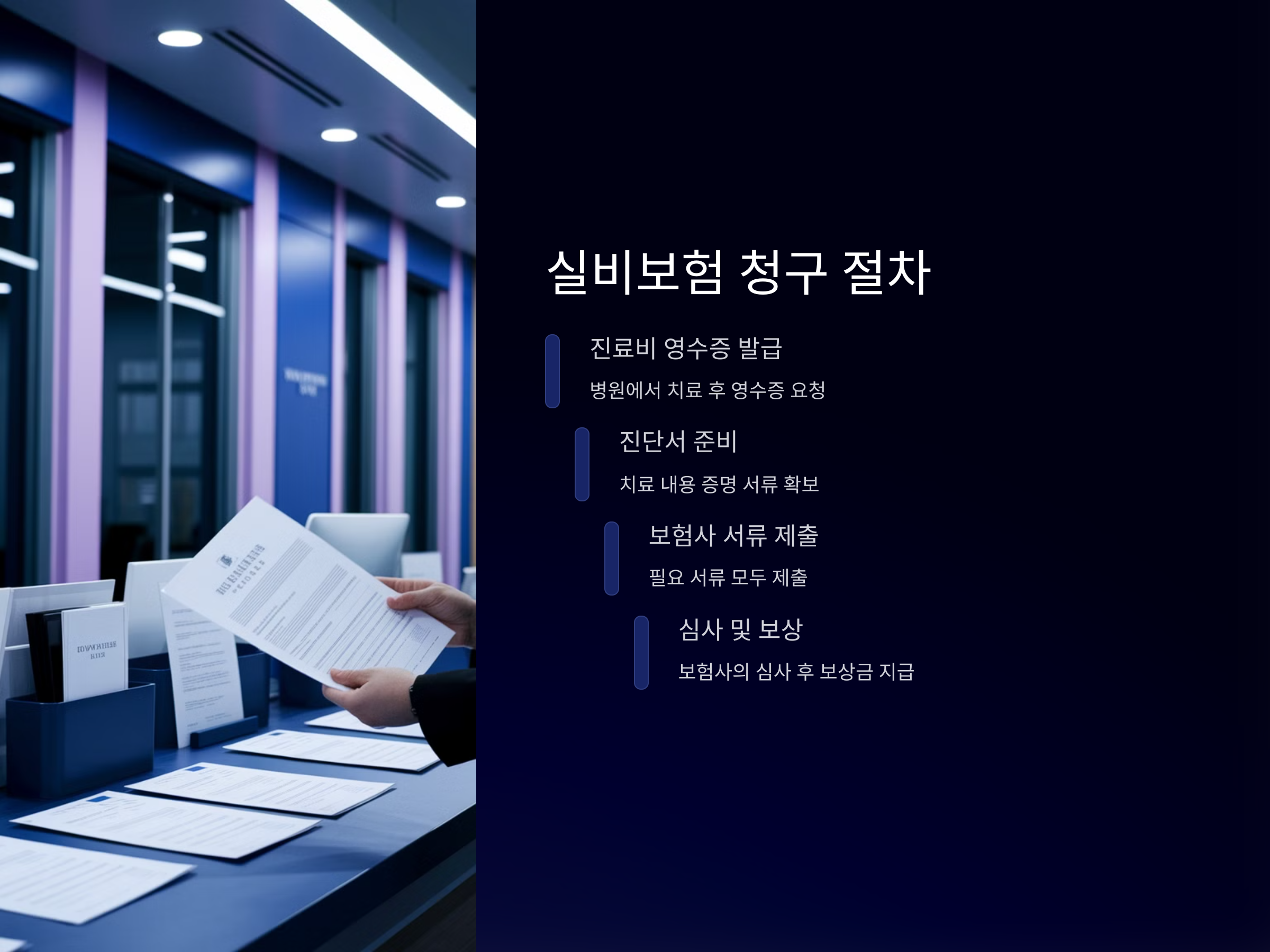먼저, 치료를 받은 병원에서 치료비 영수증과 진단서를 요청합니다. 이를 통해 보험사에 제출할 수 있는 서류가 준비됩니다. 이후 실비보험 청구를 위해 보험사에 서류를 제출하면, 보험사는 이를 심사하여 해당 치료에 대해 보상 가능한 금액을 결정합니다. 이때 중요한 점은, 신경 차단술이 실비보험에서 보장되는 항목에 포함되어 있어야 한다는 것입니다. 일부 보험사는 특정 치료법에 대해서만 보장을 제공할 수 있기 때문에, 보험 약관을 사전에 확인하는 것이 중요합니다.