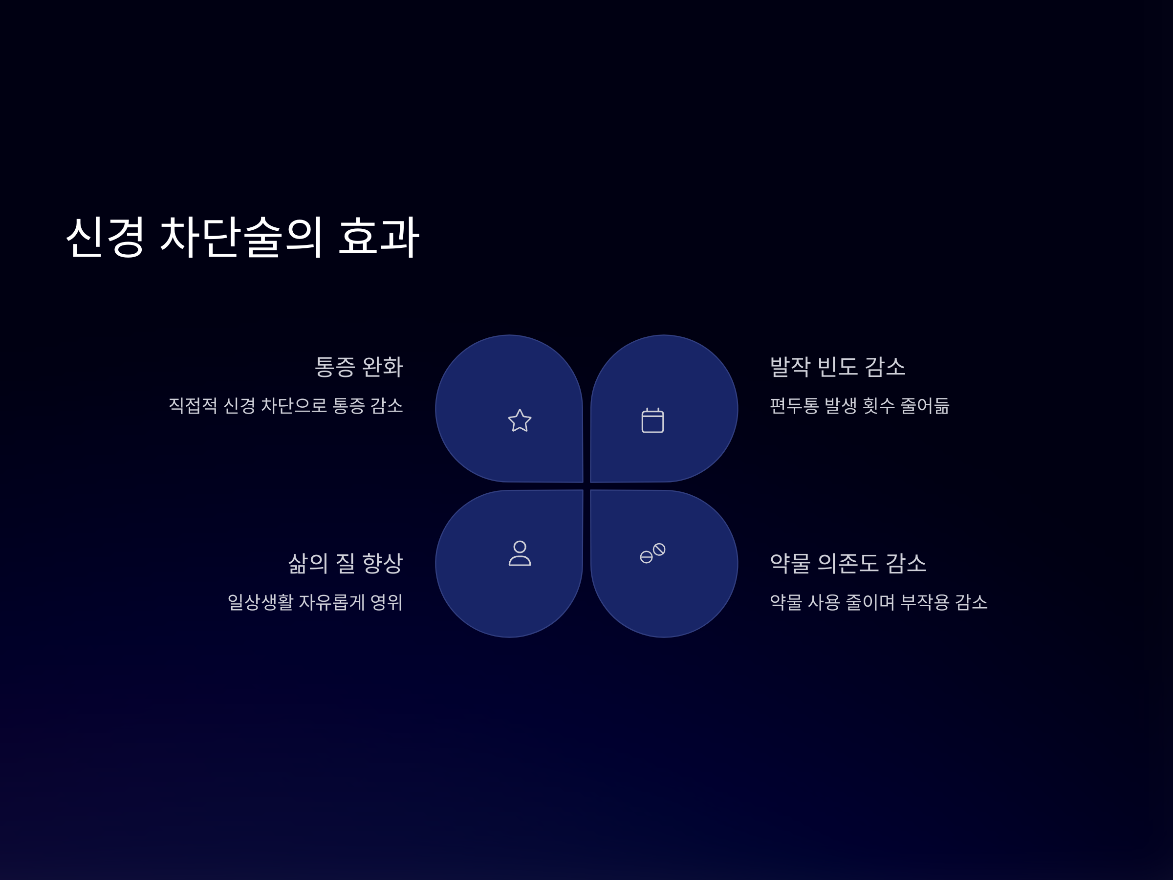 편두통 신경 차단술의 효과는 많은 환자들에게 긍정적인 결과를 보이고 있습니다. 이 치료법은 주로 약물치료로 조절이 어려운 만성 편두통 환자에게 사용되며, 신경에 직접적인 영향을 주어 통증을 완화하고 빈도를 줄여주는 효과가 있습니다. 신경 차단술은 두통의 원인이 되는 신경을 타겟으로 하여 통증을 차단하고, 환자가 일상생활을 보다 자유롭게 할 수 있도록 돕습니다.