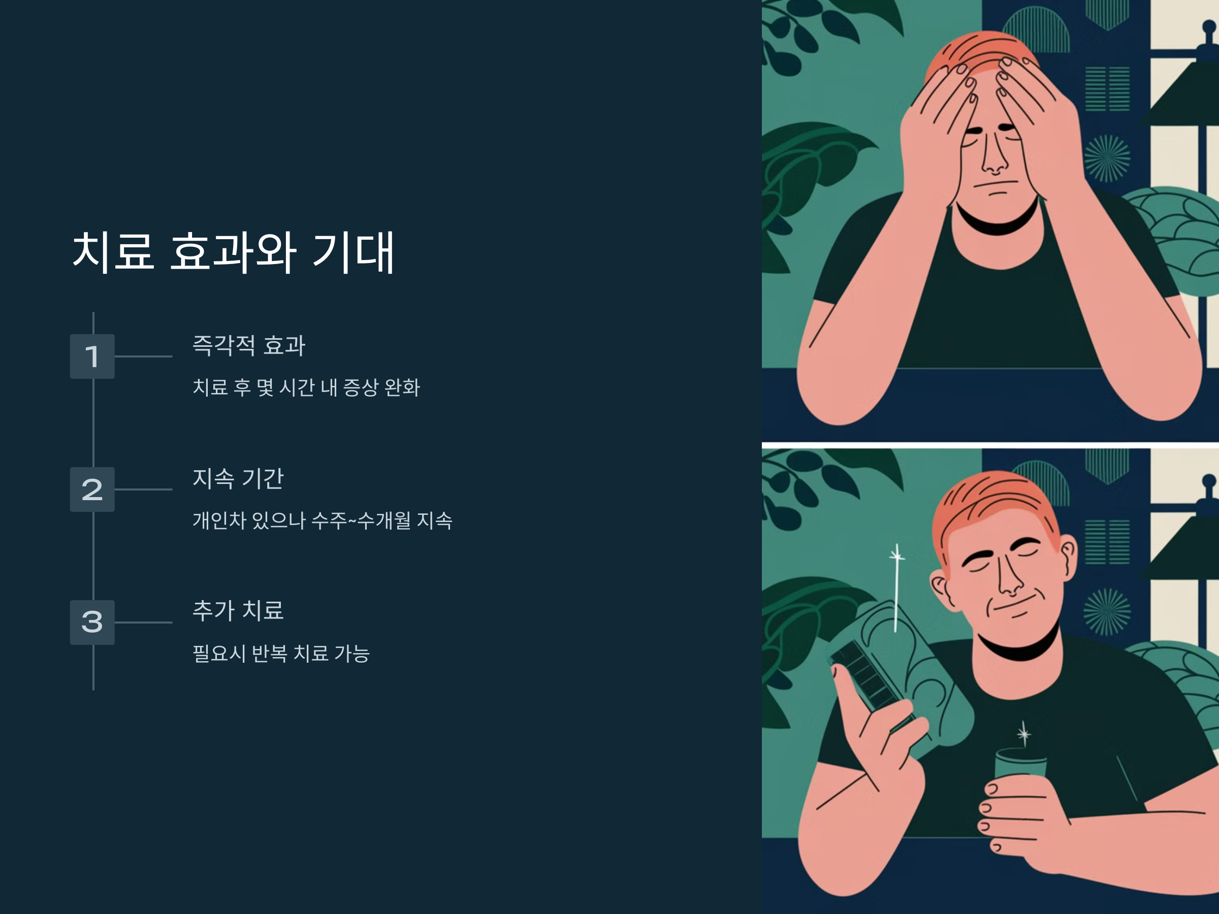 이 치료의 주요 목표는 편두통을 유발하는 신경의 신호를 차단하거나 완화하여 두통 증상을 경감시키는 것입니다. 치료는 비교적 간단하고 빠르며, 대부분의 환자들이 치료 후 몇 시간 이내에 증상 완화를 경험할 수 있습니다.