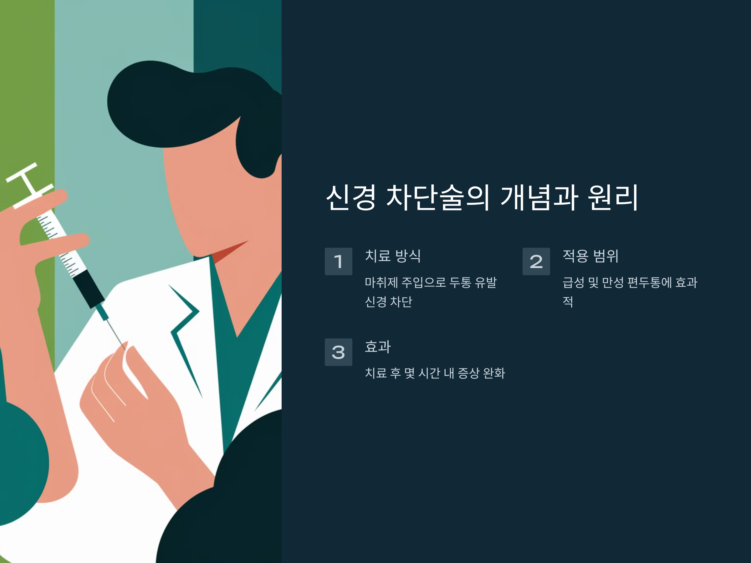 편두통 신경 차단술은 신경에 직접적으로 마취제를 주입하여 두통을 유발하는 신경의 활동을 차단하는 방법입니다. 이 치료는 일반적으로 머리나 목에 있는 특정 신경에 주사를 놓거나, 전기 자극을 통해 신경을 차단합니다. 신경 차단술은 급성 편두통의 치료뿐만 아니라 만성 편두통에도 효과적일 수 있습니다.